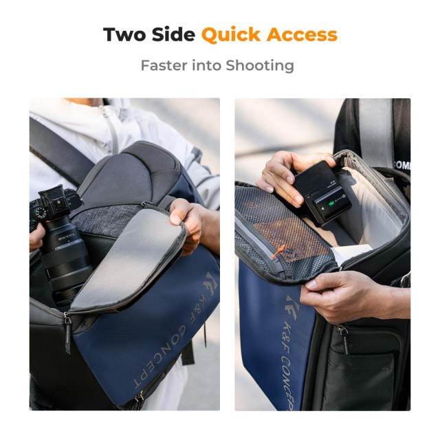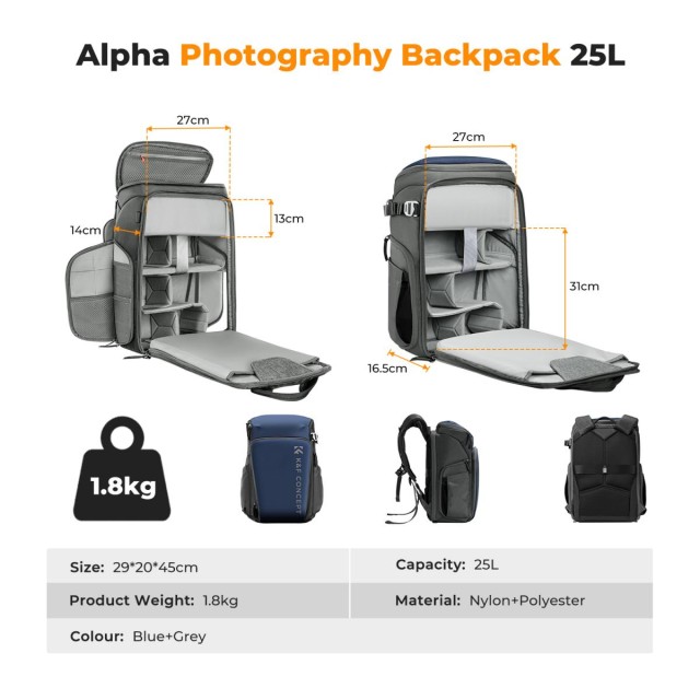 K&F Concept Camera Alpha Backpack Air 25L, Camera Bags for Photographers Large Capacity with Raincover - Backpack 25L Nature Wander 01(Blue). This photography backpack can be realized 5:5 and 2:8 space by pushing up or down for different needs. Suit for outdoor photography, urban street photography, outdoor portraits, VIOG photography, etc.
