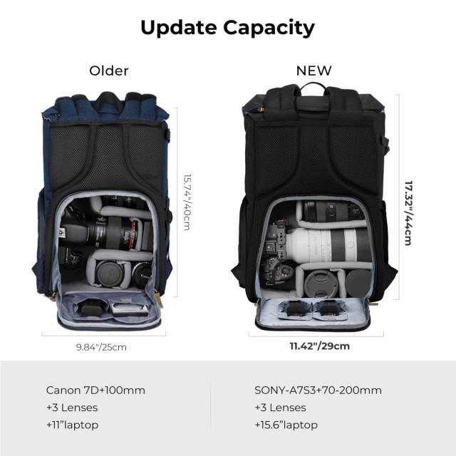 * 【Kapazitäts-Upgrade】17.32"*11.42"*6.69" (44x29x17cm); Dieser Kamerarucksack kann 1 Kamera + 3 Objektive+ 7-11'' iPad+ Stativ,und andere Foto Essentials halten.