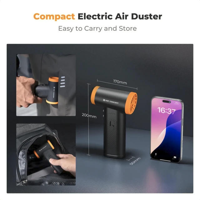 Der K&F Concept 12-in-1 Brushless Compressed Air Duster ist ein leistungsstarkes, umweltfreundliches Reinigungsgerät, das Staub sicher und effizient von Kameras, Objektiven, Sensoren, Elektronik, Tastaturen und anderen empfindlichen Geräten entfernt. Mit einem langlebigen bürstenlosen Motor, mehreren Düsenaufsätzen und einem wiederverwendbaren Design ersetzt er Einweg-Druckluftdosen für eine langfristige, zuverlässige Wartung.