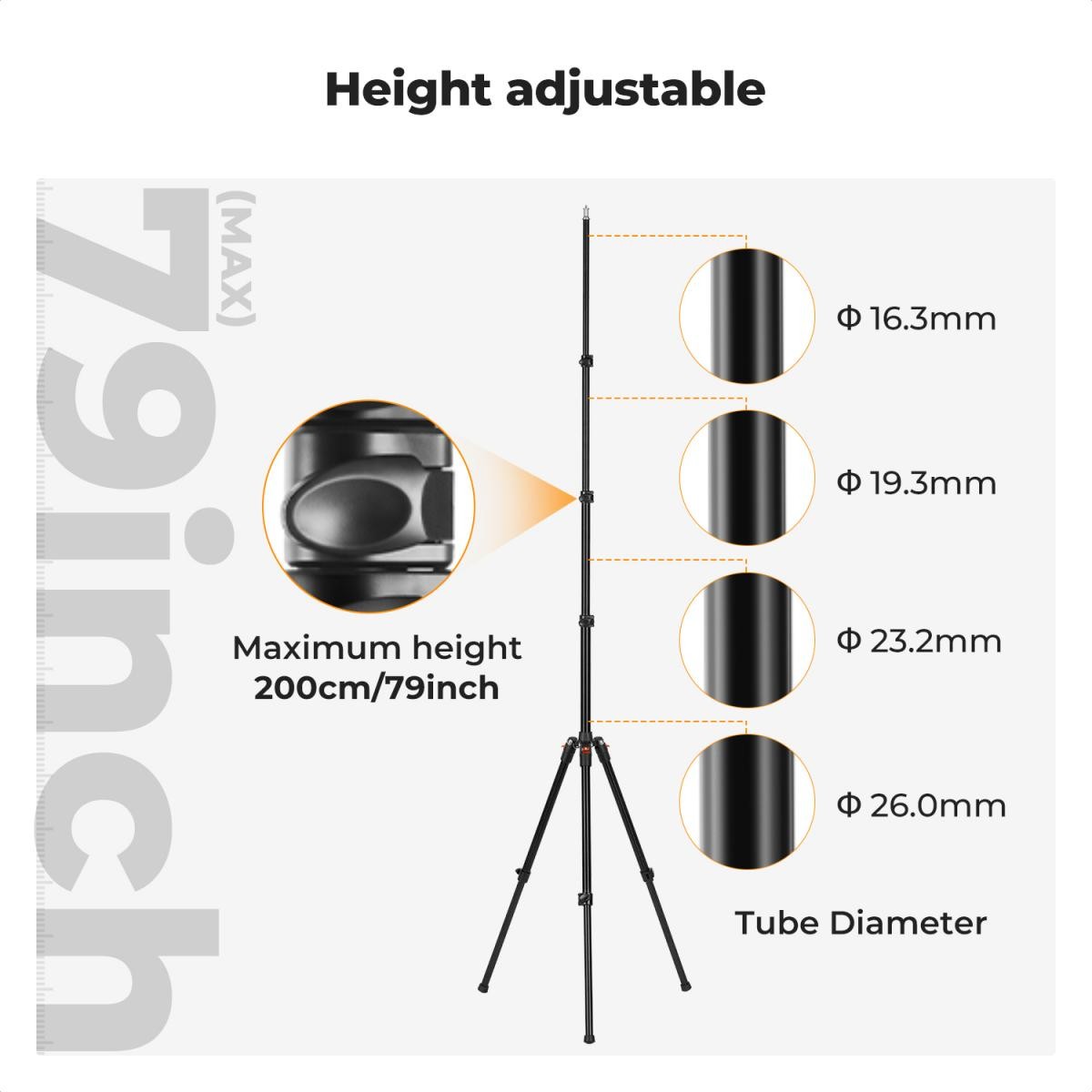 Das Stativ ist aus einer widerstandsfähigen Aluminiumlegierung gefertigt und trägt bis zu 5 kg. Es ist mit einem Haken zum Aufhängen von Sandsäcken für bessere Stabilität ausgestattet und verfügt über einen einstellbaren Beinabstand für einen festeren Stand.