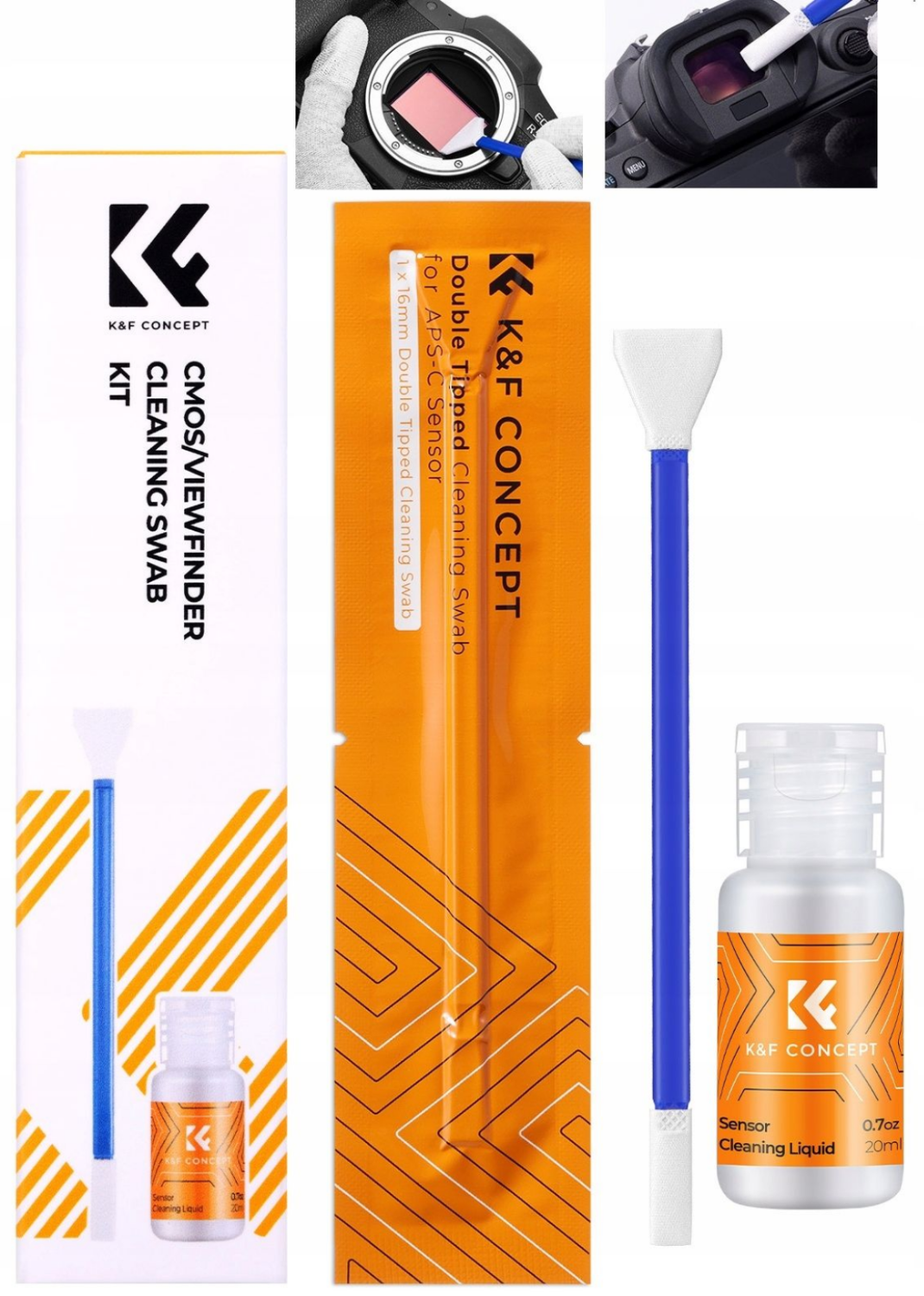 Das K&F Concept 2-in-1-Kamerareinigungsset ist eine Komplettlösung für die sichere Reinigung von APS-C-Kamerasensoren und Suchern und enthält Reinigungsstäbchen mit zwei Spitzen sowie 20 ml professionelle Sensorreinigungsflüssigkeit.