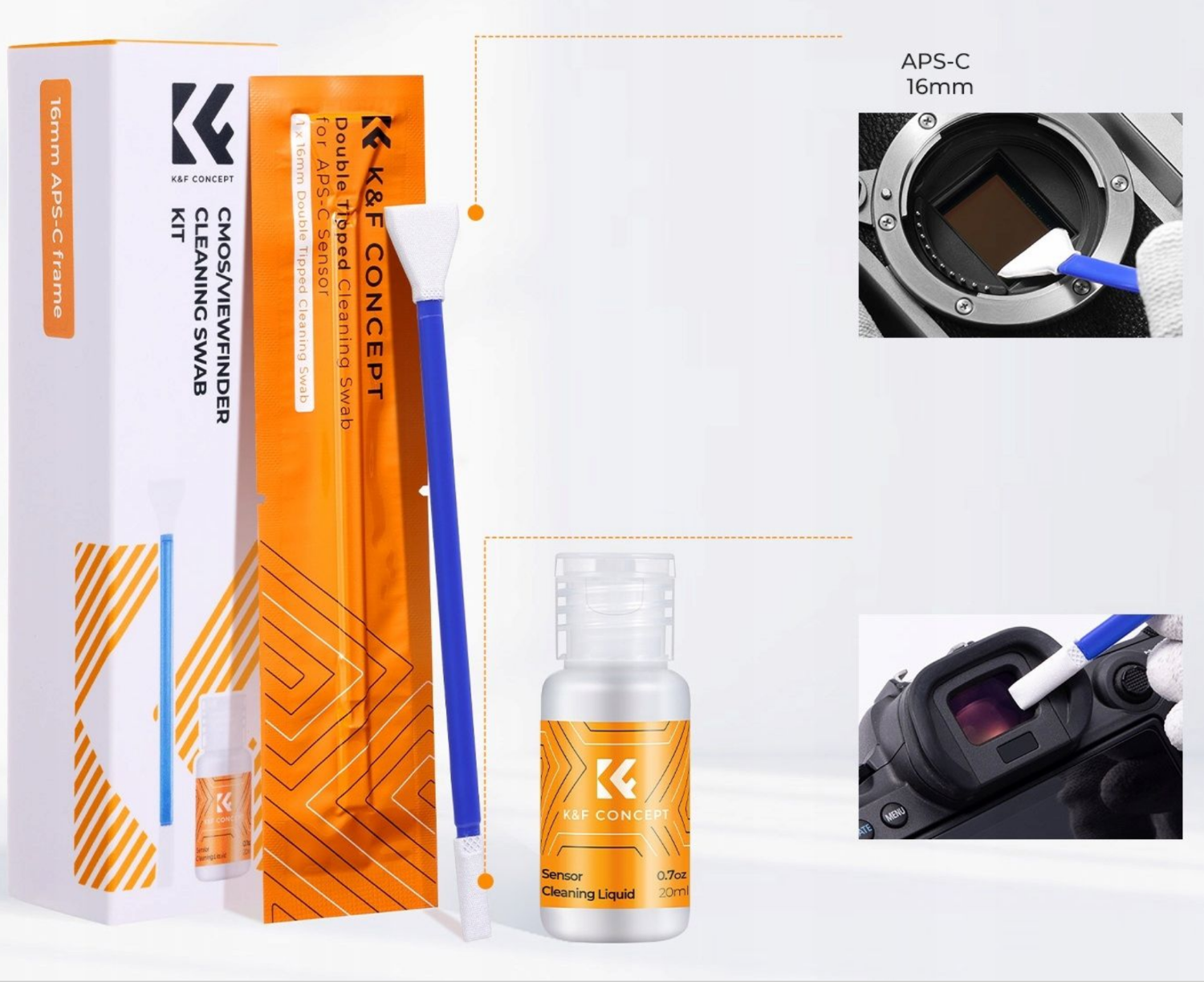 Das K&F Concept 2-in-1-Reinigungsset wurde für Fotografen und Videografen entwickelt, die eine sichere, präzise und effektive Pflege ihrer Kameraausrüstung benötigen. Dieses umfassende Set enthält fünf sterile Reinigungsstäbchen mit zwei Enden und 20 ml Sensor-Reinigungsflüssigkeit, mit denen Sie sowohl den APS-C-Kamerasensor (Matrix) als auch den Sucher zuverlässig reinigen können.