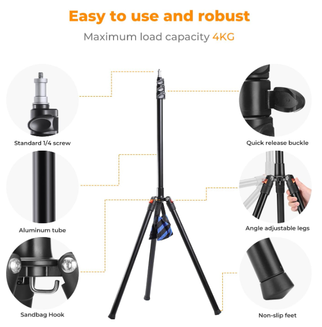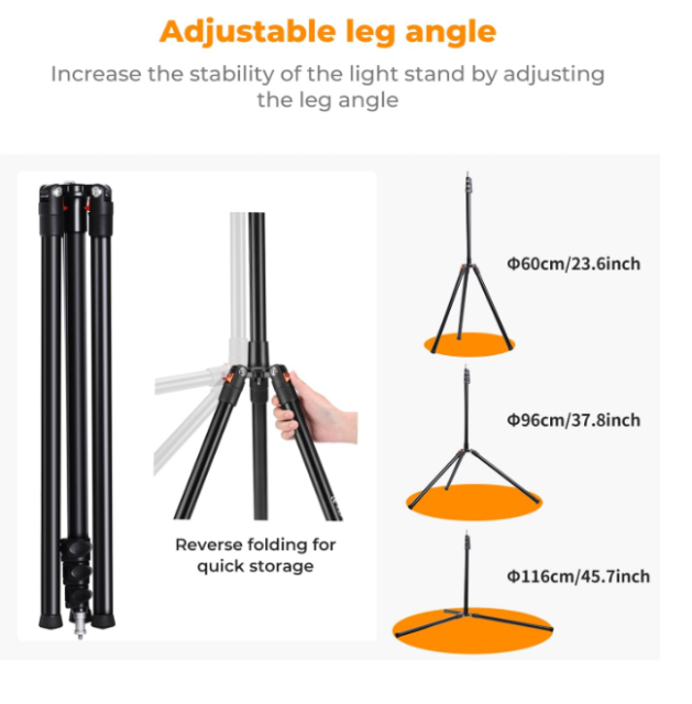 Für zusätzlichen Komfort lässt sich der Ständer vollständig umklappen, um ihn ultrakompakt zu verstauen, und wird mit einer strapazierfähigen Aufbewahrungstasche geliefert, die ihn während des Transports schützt. Ganz gleich, ob Sie in einem professionellen Studio arbeiten oder im Freien fotografieren, der K&F Concept Light Stand bietet professionelle Leistung in einem reisefreundlichen Formfaktor – und beweist, dass eine robuste Halterung nicht unbedingt schweres Gerät bedeuten muss.