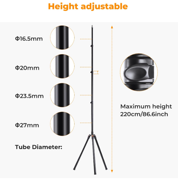 Das K&F Concept 86,6 Zoll/2,2 m Aluminium-Lichtstativ ist ein kompaktes, leichtes Stativ für Studio- und Außenaufnahmen. Es verfügt über einen einzigartigen, zusammenklappbaren Stativfuß, der sich auf nur 21,7 Zoll zusammenklappen lässt und somit leicht zu transportieren ist. Es besteht aus einer robusten Aluminiumlegierung mit Schnellverschlüssen für eine reibungslose Höhenverstellung von 3,35 ft bis 7,21 ft und trägt bis zu 8,8 lbs an Ausrüstung, darunter Softboxen, Blitzgeräte, Reflektoren und Schirme – komplett mit einer 1/4"-Schraubbefestigung und einer mitgelieferten Aufbewahrungstasche für professionelle Vielseitigkeit und Mobilität.