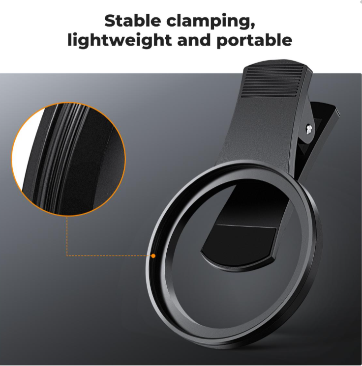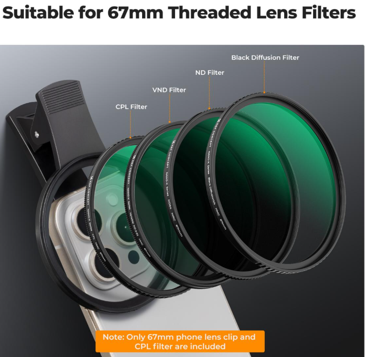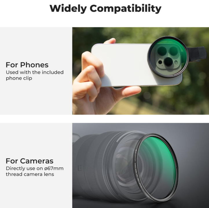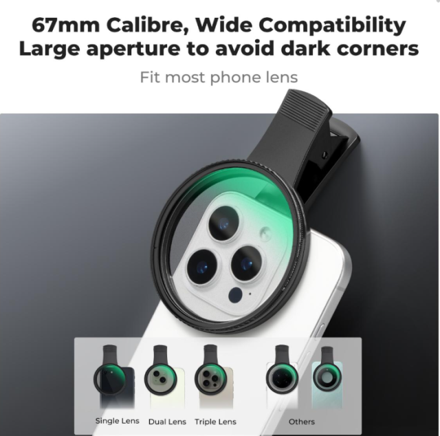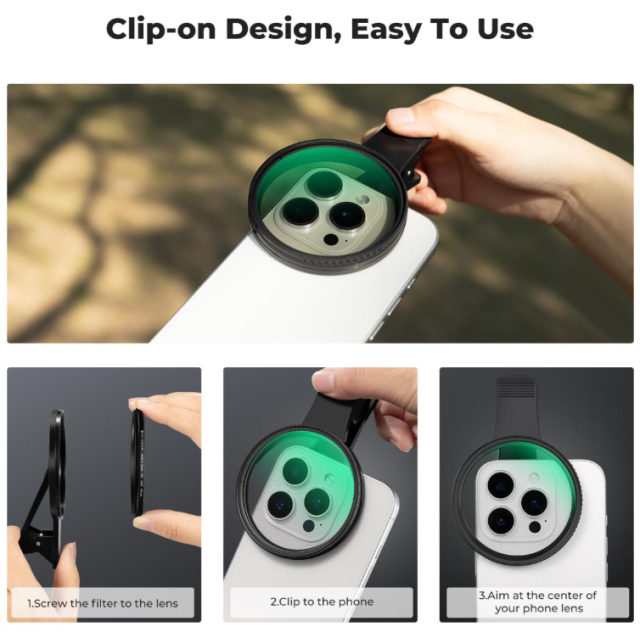 Der Filter wurde für optische Spitzenleistungen entwickelt und verfügt über 18 Schichten einer fortschrittlichen Antireflexbeschichtung, die Oberflächenreflexionen und Geisterbilder deutlich reduziert und selbst bei hellen Lichtverhältnissen kristallklare Bilder gewährleistet, wobei Bildkontrast und Details erhalten bleiben. Die Installation ist dank des innovativen Back-Clip-Designs mühelos, mit dem der Filter in Sekundenschnelle sicher direkt am Kameramodul Ihres Telefons befestigt werden kann – ohne Werkzeuge, Adapter oder modellspezifische Anpassungen, sodass er eine unkomplizierte Ergänzung Ihrer Ausrüstung darstellt.