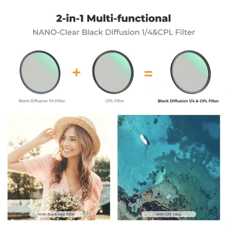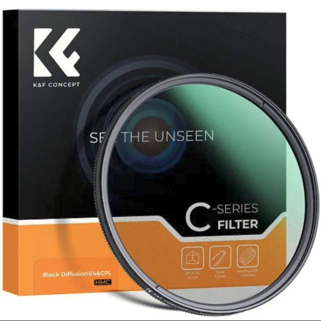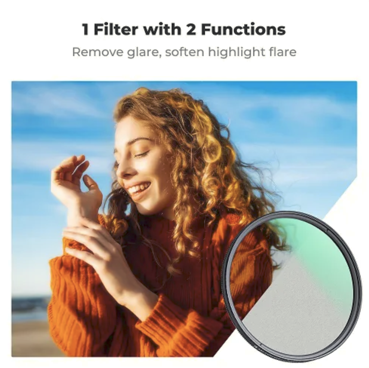 Der K&F Concept 72 mm 2-in-1 Black Mist 1/4 + CPL-Filter kombiniert filmische Diffusion mit präziser Polarisationssteuerung und sorgt für weichere Lichter, aufgehellte Schatten, reduzierte Reflexionen und verbesserte Farben – alles in einem schlanken, langlebigen, mehrfach beschichteten Design, das sich perfekt für Porträts, Landschaften und professionelle Videoaufnahmen eignet.