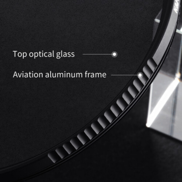 Der Filter ist aus robustem Aluminium gefertigt und hat ein schlankes Design, um Interferenzen mit Weitwinkelobjektiven zu vermeiden. Er verfügt über eine Mehrfachbeschichtung, die für Klarheit sorgt und gleichzeitig resistent gegen Kratzer ist. Außerdem ist er an der Seite gerändelt, um das Abnehmen und Anbringen zu erleichtern.