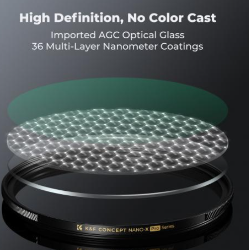 Der K&F Concept 77 mm Black Mist 1/8 Filter (Nano-X Pro Serie) verfügt über einen CNC-gefrästen Messingrahmen, eine Beschichtung mit extrem geringer Reflexion von 0,15 % und einen 36-lagigen Nanobeschichtung auf AGC-Optikglas für eine weiche, filmische Streuung. Er minimiert Geisterbilder, glättet Hauttexturen und verleiht Porträts und Nachtaufnahmen einen traumhaften Glanz, während Details erhalten bleiben. Dank seiner Wasser-, Öl- und Kratzfestigkeit ist er langlebig und leicht zu reinigen.