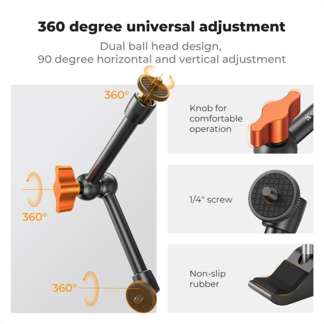 Der K&F Concept 9,8" Magic Arm mit Klemme kann mit verschiedenen Fotozubehörteilen verwendet werden. Ob Sie aus der Höhe oder aus einem niedrigen Winkel fotografieren, mit diesem Arm können Sie neue Blickwinkel entdecken.