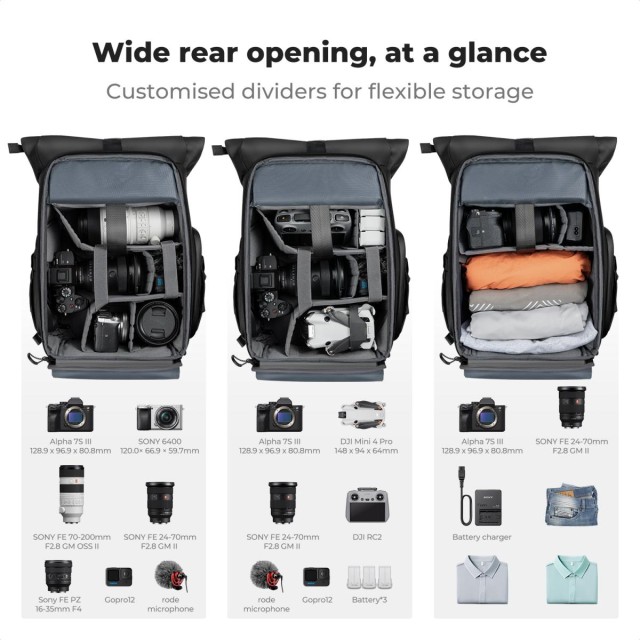 Der K&F Concept 20L Nature Wander 11 Rucksack in elegantem Schwarz wurde für Fotografen entwickelt, die schnellen Zugriff, intelligente Organisation und ganztägigen Komfort benötigen. Dank seines innovativen 180°-Rücköffnungsdesigns lässt sich die Tasche vollständig öffnen, sodass Sie Ihre Ausrüstung in Sekundenschnelle herausnehmen können, während herausnehmbare gepolsterte Trennwände eine individuelle Konfiguration für DSLR-/Spiegellose Kameragehäuse, Objektive und Zubehör ermöglichen. Mit 4 l Fassungsvermögen oben und 2 l Fassungsvermögen vorne an erweiterbaren Taschen erhalten Sie flexiblen Stauraum für persönliche Gegenstände oder zusätzliche Filter. Ein spezielles, gepolstertes 15,6-Zoll-Laptopfach schützt Ihre Bearbeitungsstation, und die Stativgurte an der Unterseite halten Ausrüstung bis zu einer Länge von 50 cm. Mehrere Taschen – darunter zwei seitliche Zugänge, interne Netzfächer, Batteriehalter und eine Speicherkartentasche – sorgen dafür, dass Sie alles Wichtige griffbereit haben. Die ergonomische Rückwand mit Luftzirkulation, die atmungsaktive Polsterung und die breiten Schultergurte sorgen für Belüftung und Komfort auf langen Wanderungen oder bei Aufnahmen in der Stadt. Damit ist dieser Rucksack die ultimative Kombination aus Schutz, Vielseitigkeit und reisefreundlichem Design.