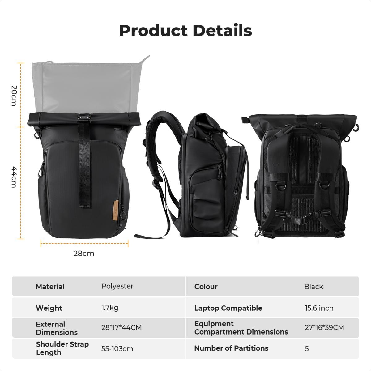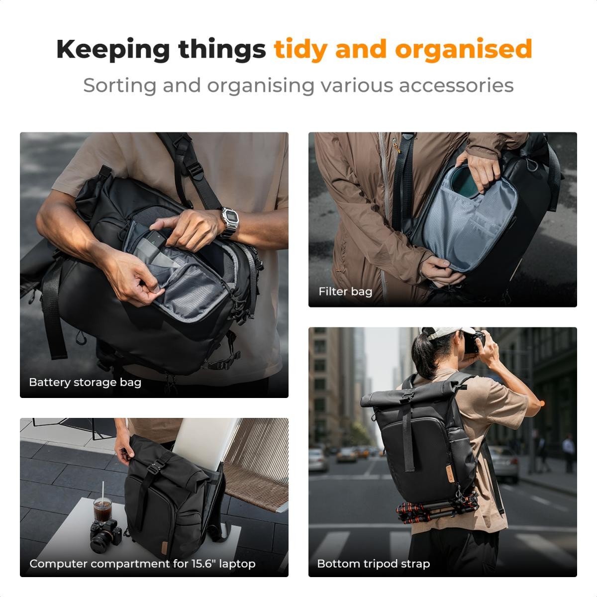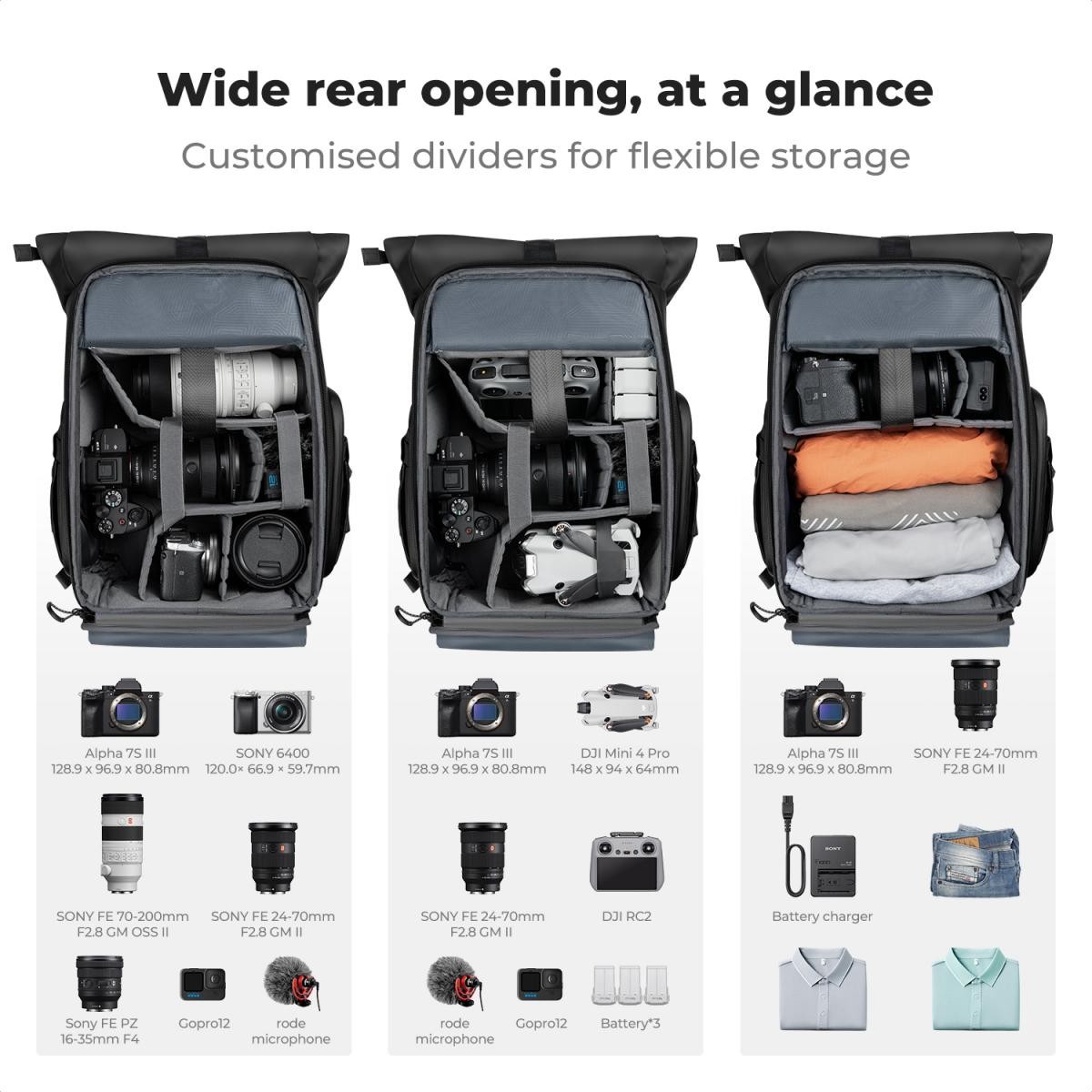 K&F Concept 20L Nature Wander 11 Rucksack (schwarz): 180°-Kamerafach mit flexiblen Trennwänden, 15,6-Zoll-Laptoptasche, erweiterbarem 6-Liter-Stauraum und Stativgurten für komfortable ganztägige Fotoausflüge.