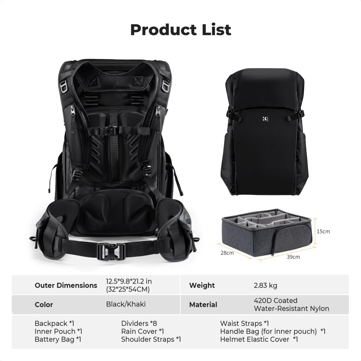 K&F Concept 30L Kamerarucksack, professioneller wasserdichter DSLR-Rucksack mit herausnehmbarem, anpassbarem Einsatz, verstellbaren Trägern – passend für 15-Zoll-Laptop, Kameraausrüstung, Rucksack 30L Star Wander01 Schwarz