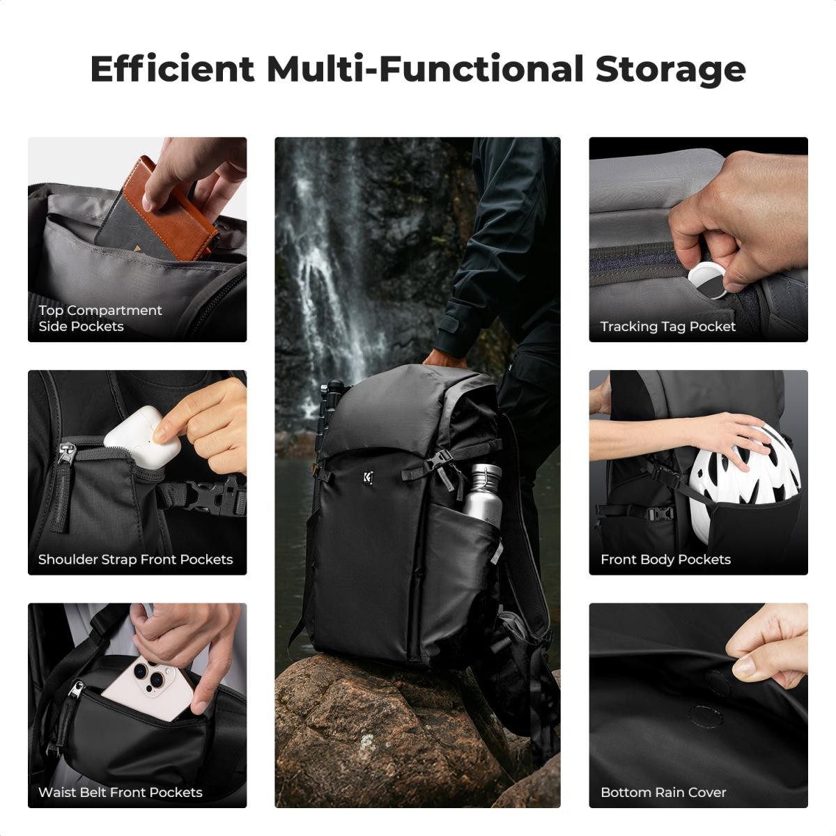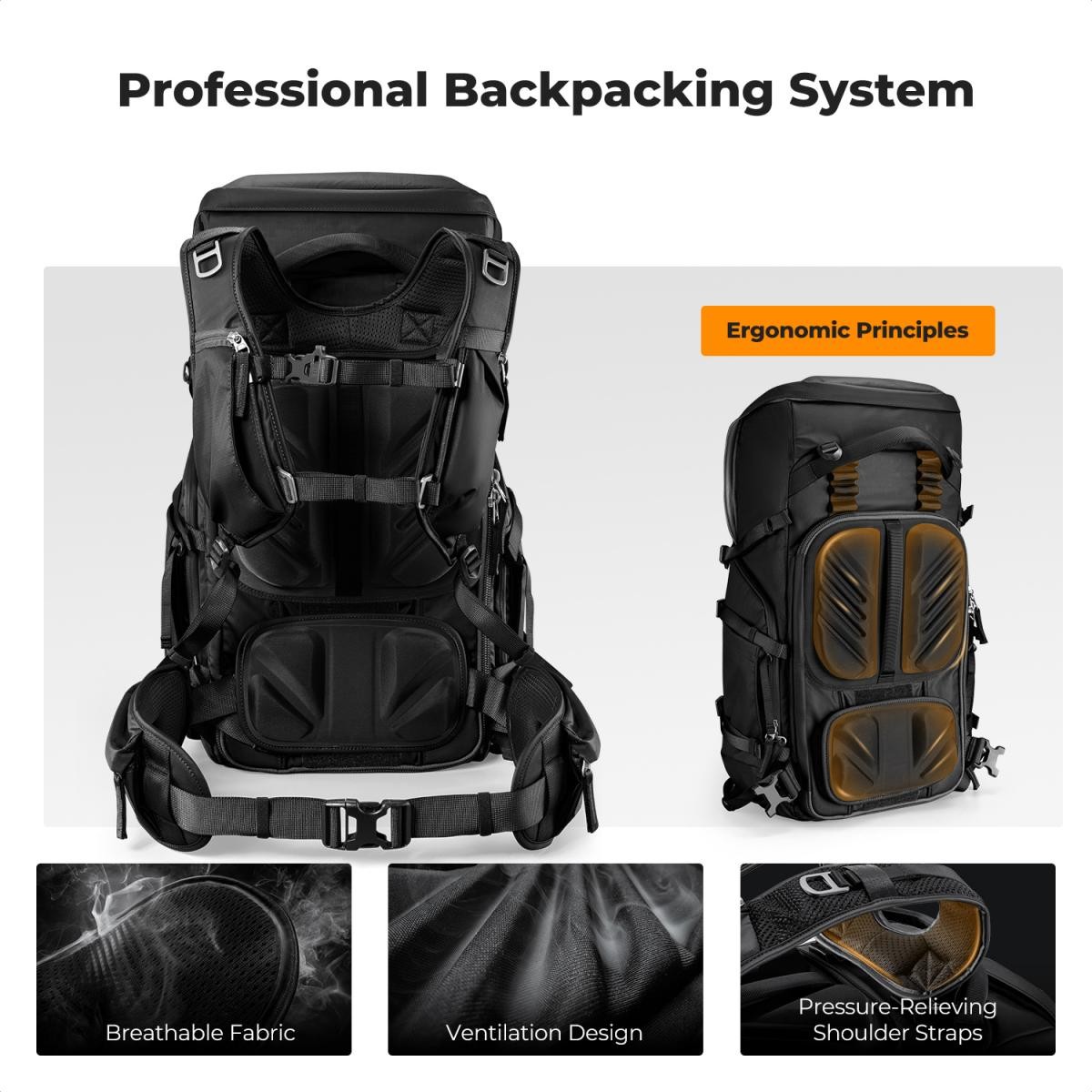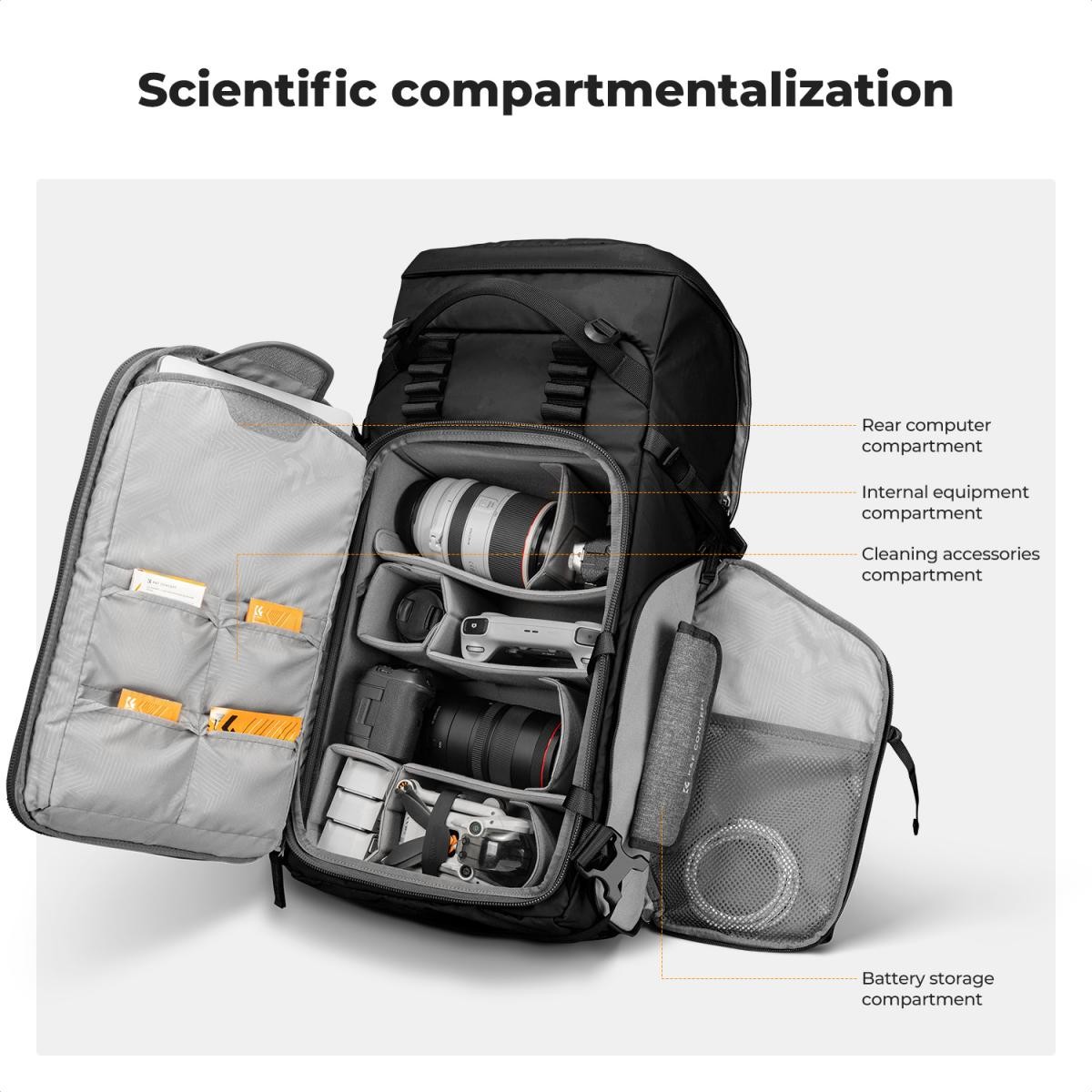 Der K&F CONCEPT Star Wander05 40L Kamerarucksack (schwarz) bietet vielseitigen Stauraum mit großem Fassungsvermögen für Fotografen und Reisende. Er ist für 2 Kameras, 6 Objektive und Zubehör ausgelegt und verfügt über anpassbare Fächer, einen schnellen seitlichen Zugriff, ergonomische Gurte und strapazierfähiges, spritzwassergeschütztes 420D-Nylon für zuverlässigen Schutz bei jedem Abenteuer.