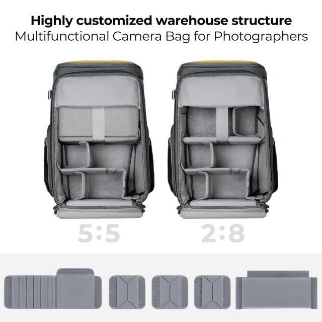 Der innovative Magic Bin Fotorucksack mit anpassbarem 5:5- und 2:8-Fachdesign eignet sich für verschiedene fotografische Anforderungen, einschließlich Outdoor-, Street- und Porträtfotografie. Er gewährleistet Stabilität durch verdeckte interne Stützfaser-Verstärkungsstäbe, und die vordere Breitenerweiterung ermöglicht eine Kapazitätserweiterung um 2-3 Liter. Der Zugang von oben und von der Seite sowie das aufgehängte 16-Zoll-Computerfach bieten Komfort und Sicherheit und verhindern, dass der Computer direkt angestoßen wird. Ideal für Fotografen, die Vielseitigkeit und Schutz für ihre Ausrüstung suchen.