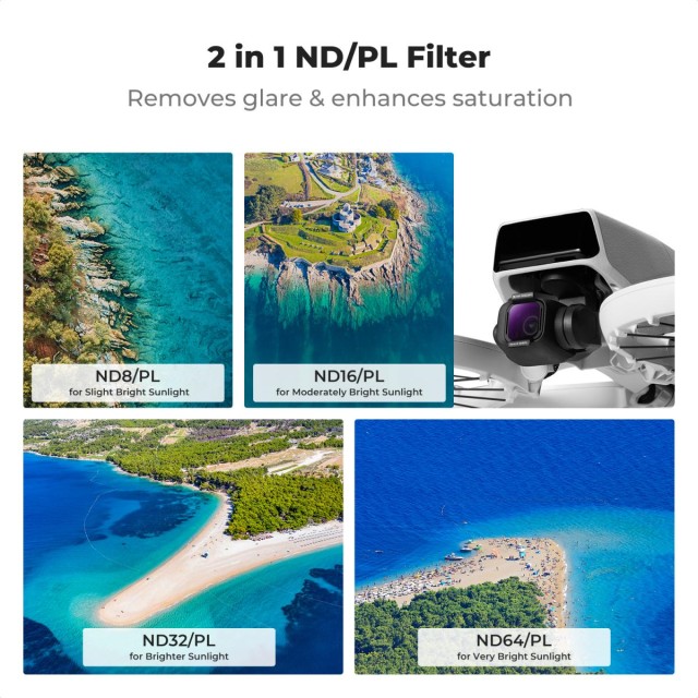 ND/PL-Filterset für die DJI Flip-Drohnenkamera, das dabei hilft, die Lichtmenge zu regulieren und den Kontrast und die Farben der Aufnahmen zu verbessern. Das Set enthält folgende Filter: ND8/PL, ND16/PL, ND32/PL, ND64/PL.