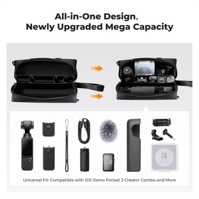 K&F Tasche für DJI Osmo Pocket 3. Mit der offiziellen DJI Osmo Pocket 3 Tragetasche ist Ihre Ausrüstung sicher und stilvoll verstaut. Diese elegante Tasche wurde speziell für das Creator Combo entwickelt und bietet sicheren Stauraum für Ihre Kamera und wichtiges Zubehör.