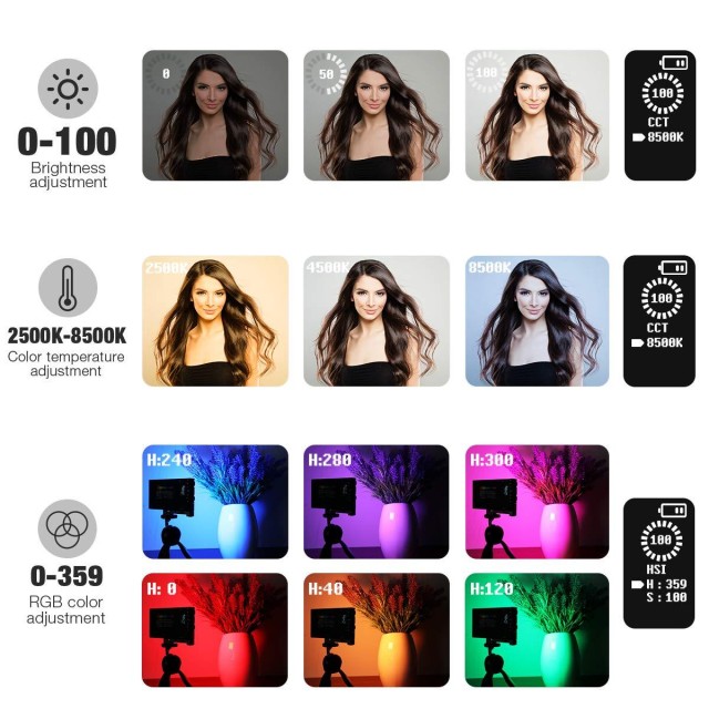 * [Farbton, Sättigung, Helligkeit, Farbtemperatur einstellbar] Farbton kann im Bereich von 0 Grad -359 Grad eingestellt werden; Farbsättigung kann zwischen 0%-100% eingestellt werden; Helligkeit kann von 0%-100% eingestellt werden; Farbtemperatur dimmbar von 2500K (warme Farbe) bis 8500K (kühle Farbe), das eingebaute LCD-Display kann genaue Messwerte liefern, so dass Sie effektiver arbeiten können