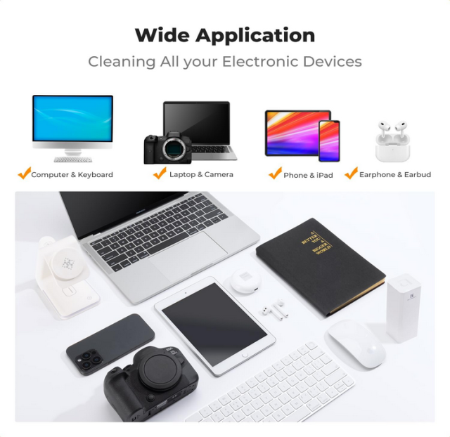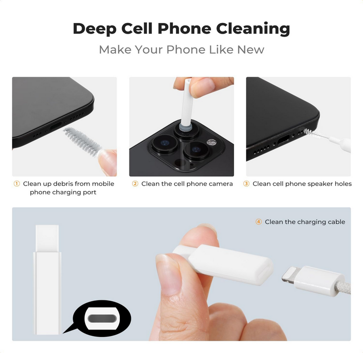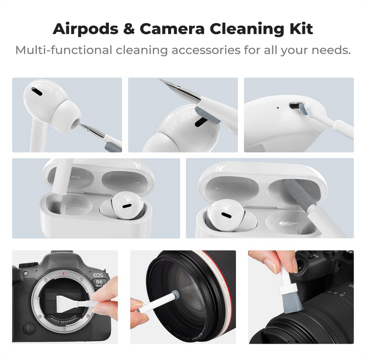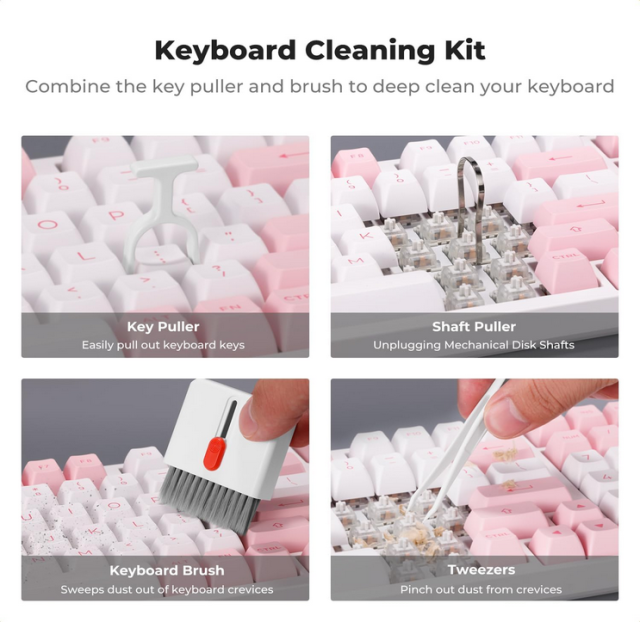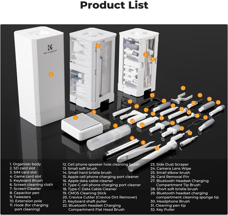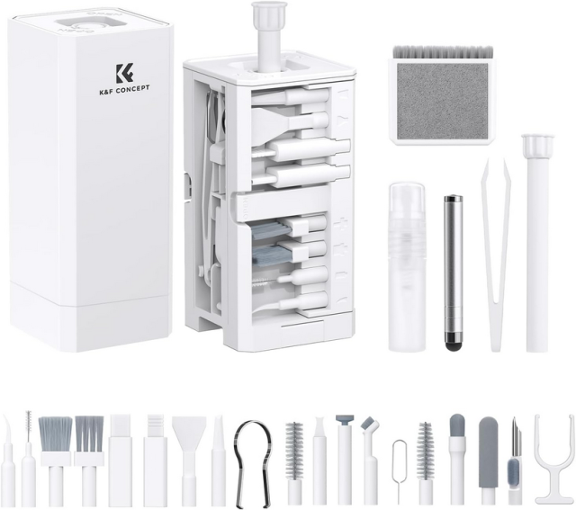 Mit dem K&F Concept 32-in-1-Tastaturreinigungsset, einer vielseitigen All-in-One-Lösung für die mühelose Pflege von Tastaturen, Smartphones, Kopfhörern, Laptops und vielem mehr, erreichen Sie jeden Winkel Ihrer technischen Geräte. Dieses kompakte Kit enthält als Herzstück eine ausziehbare große Bürste, gepaart mit Spezialwerkzeugen wie abgewinkelten Spitzen für Ladeanschlüsse und Lautsprecher, Silikonreinigern für Lightning- und USB-C-Anschlüsse, einem SIM-Karten-Auswerfer und einem Stylus-Stift für präzise Bildschirminteraktion. Entfernen Sie hartnäckigen Schmutz von Kopfhörern mit dem doppelseitigen Reinigungsstift (Metallspitze für hartnäckige Flecken, Minibürste für Gitter), dem runden Schwamm für das Innere von Ladecases und den weichen Bürsten zum Entfernen von Staub – alles ergänzt durch einen ausziehbaren Griff für schwer zugängliche Stellen. Bei Tastaturen entfernt die hochdichte Bürste Oberflächenstaub, während Tastenkappen- und Schalterzieher eine einfache Demontage für mechanische Konfigurationen ermöglichen; für eine gründliche Tiefenreinigung kommen die Bürste mit harten Borsten und die Pinzette hinzu. Eine 5-ml-Sprühflasche (leer, bereit für Ihre Reinigungslösung) sorgt in Kombination mit Fasertüchern dafür, dass Fingerabdrücke und Fettflecken von Bildschirmen von Smartphones, Tablets oder Monitoren verschwinden. Der ergonomische Hauptkörper dient gleichzeitig als sichere Aufbewahrungsmöglichkeit für SD-/SIM-Karten, sodass alles organisiert und transportabel bleibt. Dieses Kit wurde für den täglichen Gebrauch bei kleinen Elektronikgeräten entwickelt und sorgt mit langlebigen, integrierten Werkzeugen, die jeder Reinigungsaufgabe gewachsen sind, für streifenfreie und beschädigungsfreie Ergebnisse.