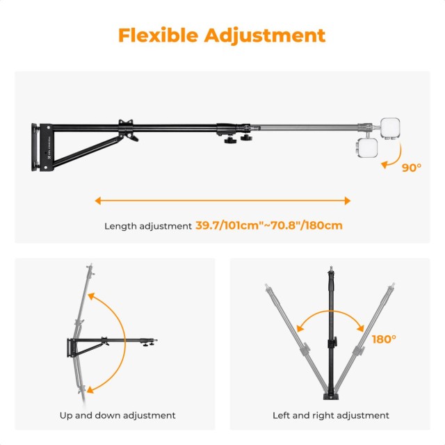 Lässt sich sicher an der Wand befestigen und bei Nichtgebrauch auf kompakte 93,5 cm (36,8") zusammenklappen, wodurch wertvoller Platz auf dem Boden frei wird und Ihr Studio aufgeräumt bleibt. Der Auslegerarm lässt sich um 180° vertikal und um 180° horizontal drehen und ermöglicht so vielseitige Winkelverstellungen. Bei Nichtgebrauch kann er platzsparend flach an die Wand geklappt werden. Er eignet sich ideal für die Befestigung von Fotolampen, Überwachungsgeräten oder Monitoren und erfüllt komplexe Positionierungsanforderungen wie Neigen, Schwenken und Ausfahren.
