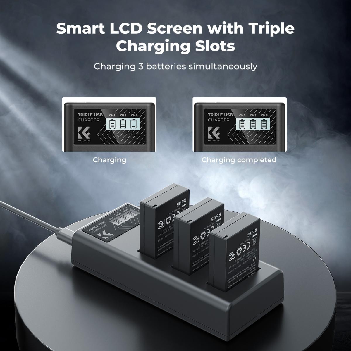 - * 【3-Slot-LPE12-Ladegerät mit LCD-Bildschirm】Das Ladegerät mit drei Steckplätzen kann 3 EOS M50-Akkus gleichzeitig effizient aufladen, und der LCD-Bildschirm zeigt den Ladezustand jedes Akkus deutlich an.