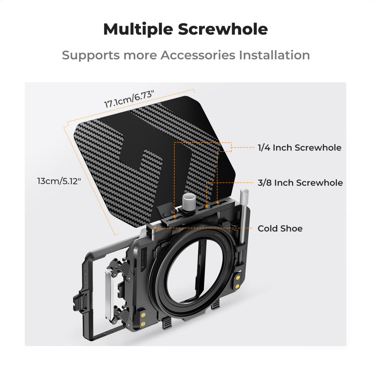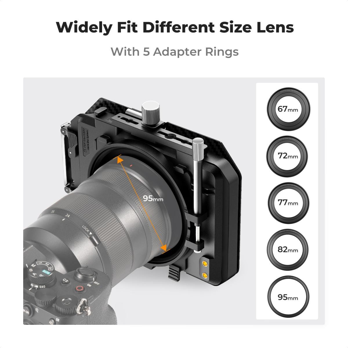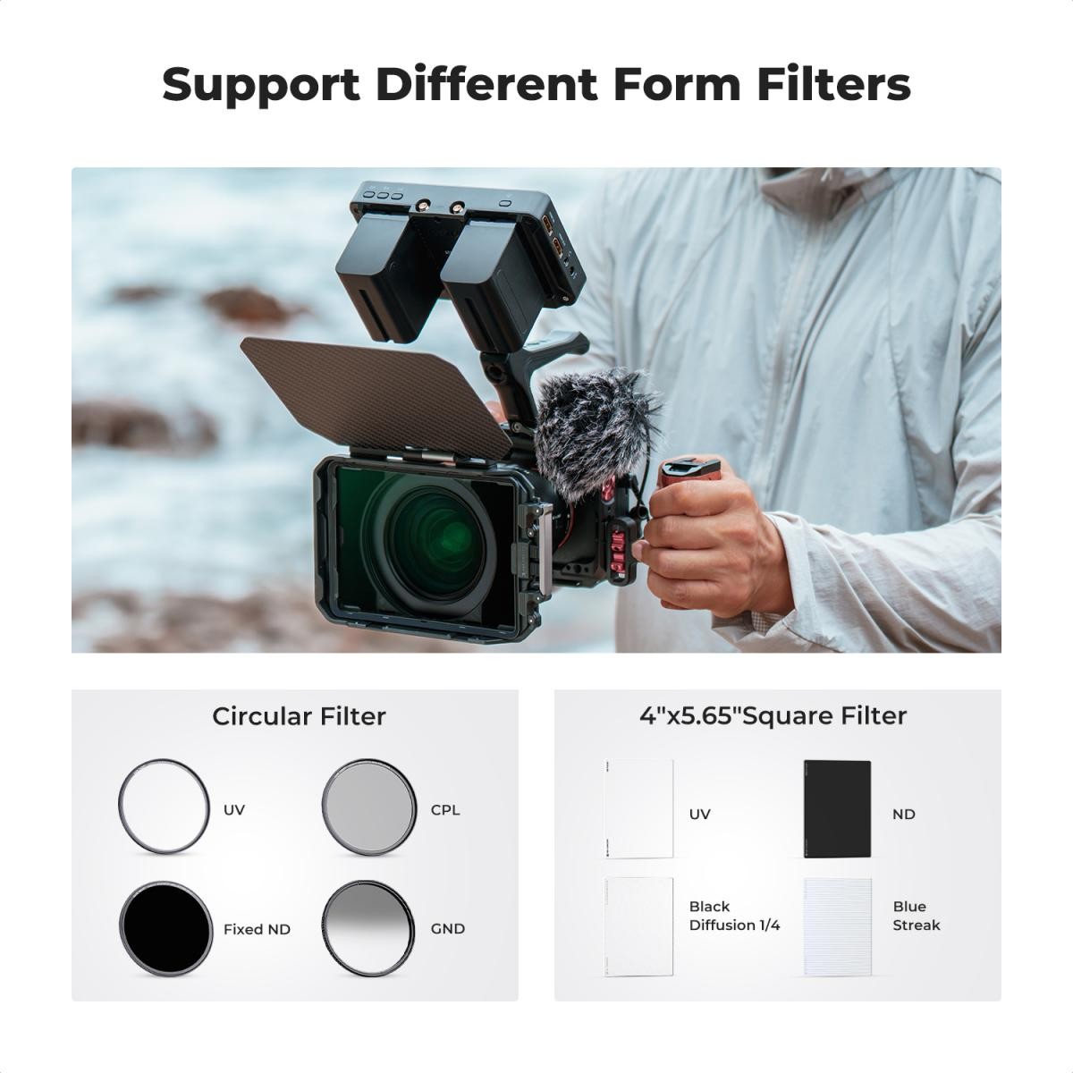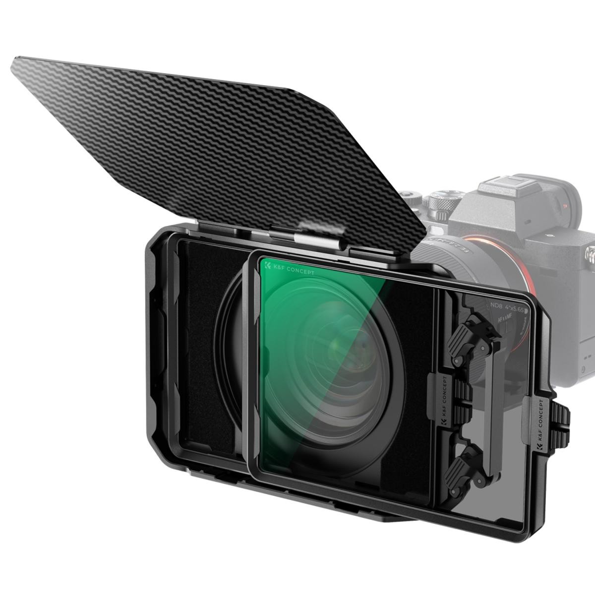 Leichte Mattebox aus Kohlefaser mit 34-mm-Flared-Design verhindert Vignettierung und Streulicht und sorgt für klare, kontrastreiche Aufnahmen mit Objektiven ab 16 mm. Bietet Platz für zwei 4x5,65-Zoll-Filter mit sicherer Verriegelung, inklusive 5 Adapterringen (67–95 mm), Erweiterungsanschlüssen, Aufbewahrungstasche und ND8-Filter mit 28-lagiger Nanobeschichtung für 4K/8K-Beständigkeit.
