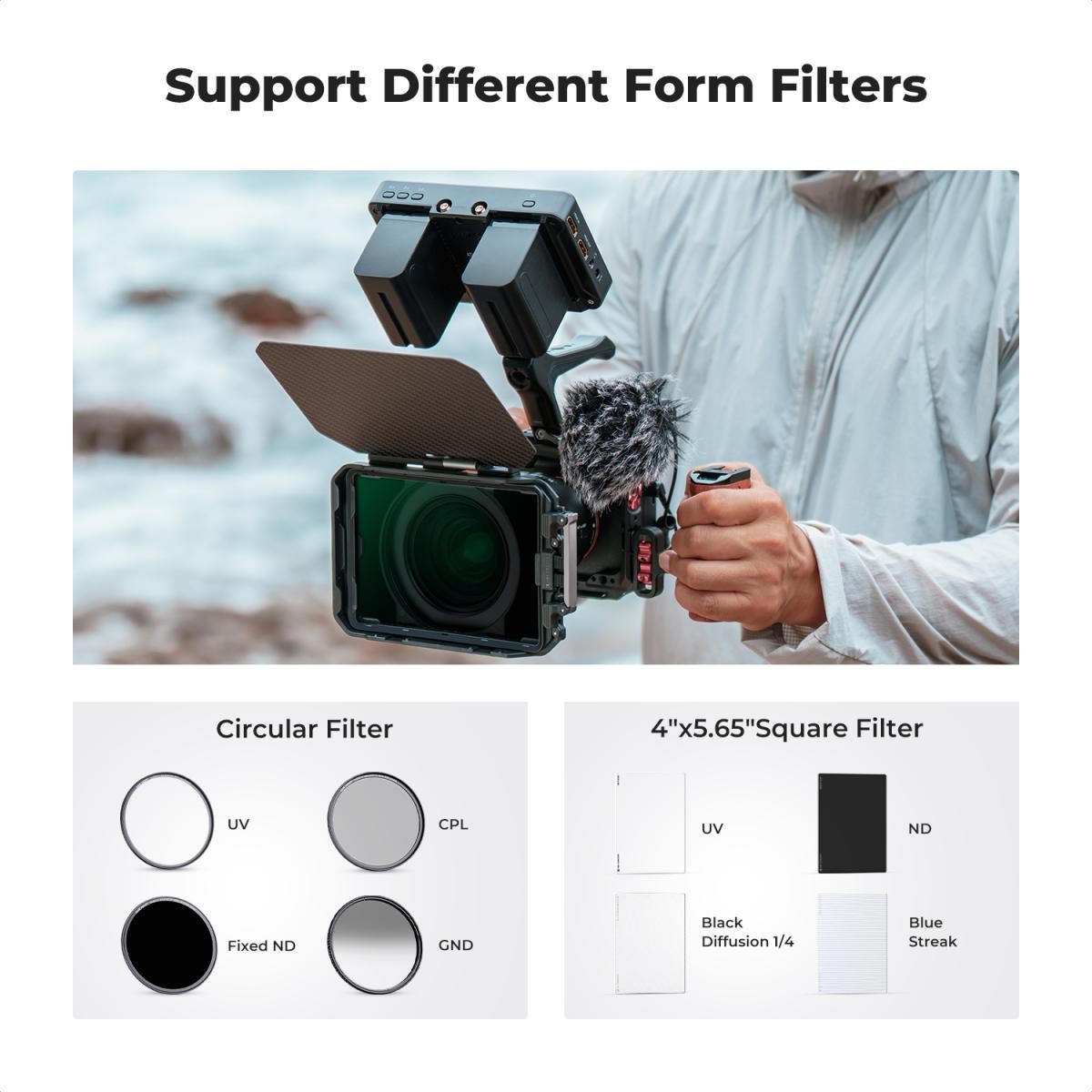 - * 【Vielseitiges und sicheres Filtersystem】Die Mattebox kann zwei 4x5,65" große Filter mit einer Dicke von 4 mm aufnehmen und verfügt über einen sicheren Verriegelungsmechanismus. Erfüllt die Anforderungen für Aufnahmen in verschiedenen Szenen.