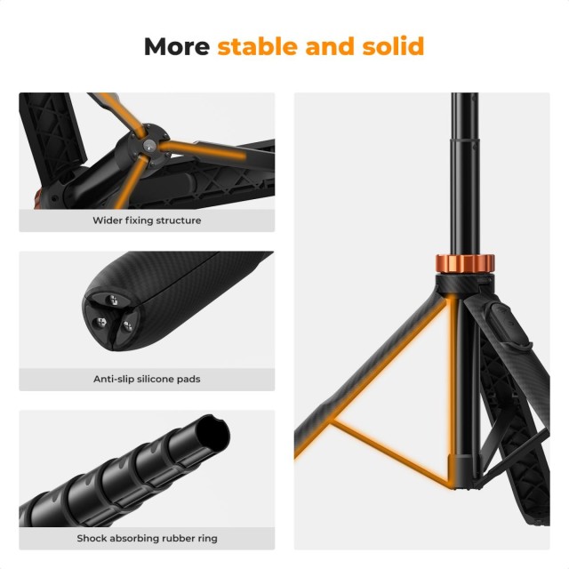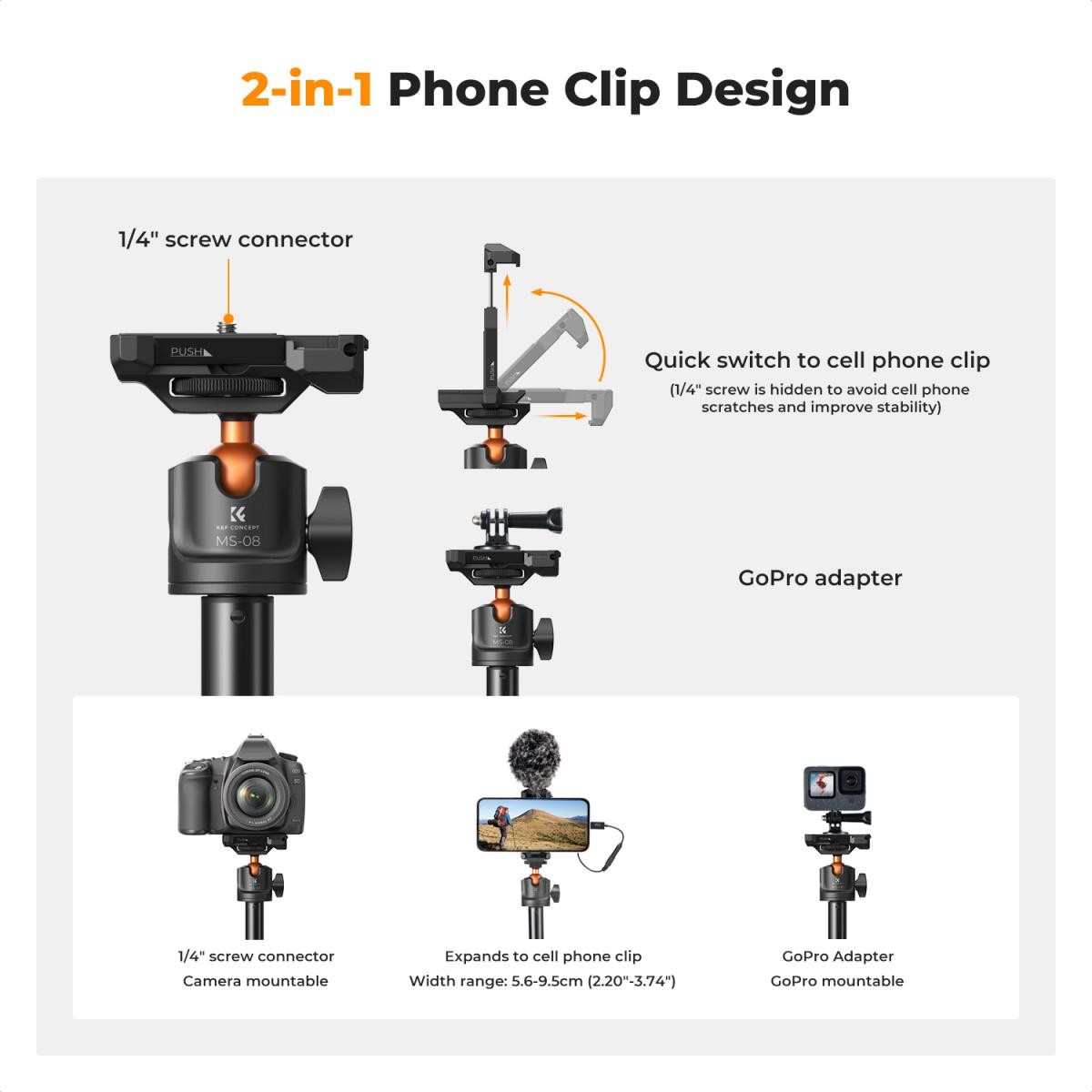 Das K&F Concept MS08 Stativ wurde für Fotografen und Content-Ersteller entwickelt, die eine kompakte und dennoch äußerst anpassungsfähige Lösung suchen. Mit einer maximalen Höhe von 157,8 cm und 7-teiligen verstellbaren Beinen ermöglicht es präzise Höhenverstellungen für jedes Aufnahmeszenario. Das Stativ trägt bis zu 3 kg und eignet sich somit ideal für die meisten spiegellosen Kameras, Smartphones und Action-Kameras. Es verfügt über einen um 360° drehbaren Kugelkopf und eine vertikale Neigung von 90°, was Aufnahmen in allen Bereichen ermöglicht, von Landschaften bis hin zu Sportaufnahmen. Eine 1/4-Zoll-Schnittstelle gewährleistet die Kompatibilität mit einer Vielzahl von Geräten, während das leichte Design (nur 97 g) für eine hohe Mobilität sorgt. Das Stativ wird mit einer kostenlosen Bluetooth-Fernbedienung geliefert, mit der mobile Nutzer Fotos und Videos aus einer Entfernung von bis zu 10 Metern aufnehmen können, wobei die Akkulaufzeit bis zu 10 Stunden beträgt. Darüber hinaus ist es dank des mitgelieferten GoPro-Adapters mit GoPro-, DJI Osmo Action- und Insta360-Kameras kompatibel, was das MS08 zu einer vielseitigen Wahl für alle Arten von Foto- und Videoaufnahmen macht.
