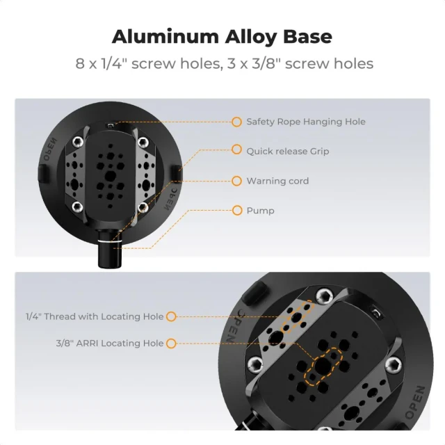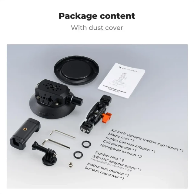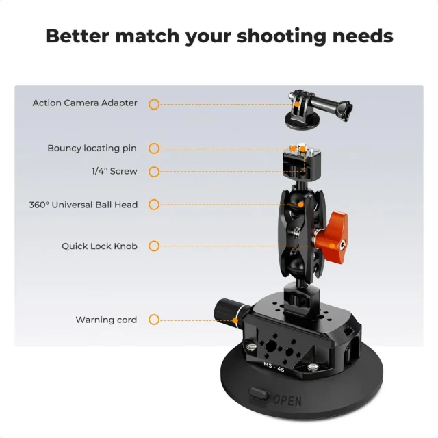 4.5-Zoll-Saugnapf-Kamerahalterung mit Doppelkugelkopf-Magic-Arm, Handyhalterung, GoPro-Adapterzubehör, 3/8-Zoll-auf-1/4-Zoll-Adapter-Schraube, MS45. Der Saugnapf verfügt über mehrere Erweiterungsanschlüsse mit 1/4-Zoll- und 3/8-Zoll-Schraubenlöchern und Positionierungslöchern. Die Oberseite der Erbsenschale verfügt über 1/4-Zoll-Teleskop-Positionierungsstifte.