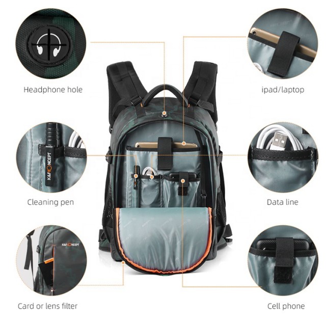 Mit seinem großen Hauptfach bietet dieser K&F-Rucksack Platz für eine digitale Spiegelreflexkamera mit angesetztem Objektiv, während ein modulares Fächersystem Objektive, Blitze, Stative und anderes Zubehör je nach Bedarf trennt, organisiert und schützt.