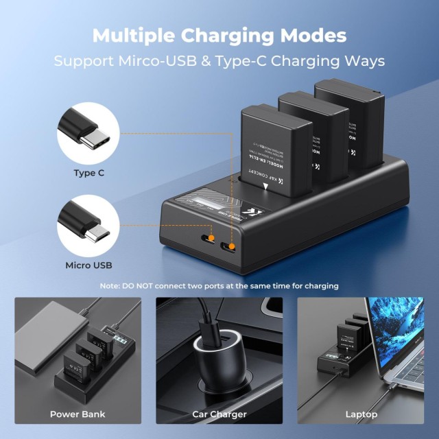 Das Kit enthält ein LCD-Ladegerät mit 3 Steckplätzen, mit dem drei Akkus gleichzeitig geladen werden können, während der Ladezustand jedes Akkus auf einem übersichtlichen LCD-Bildschirm angezeigt wird. Das Ladegerät unterstützt zwei Eingänge über Micro-USB oder Typ C (5 V/2,1 A) und ist somit mit Wandadaptern, Autoladegeräten, Laptops und anderen USB-Stromquellen kompatibel. Über den Typ-C-Eingang können alle drei Akkus in etwa 3,8 Stunden vollständig aufgeladen werden.