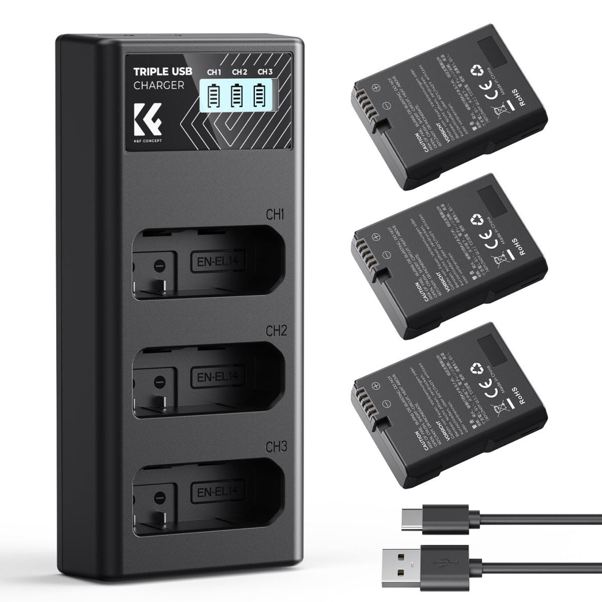 K&F Concept 3er-Pack Nikon EN-EL14 Kamera-Akkus mit 3-Slot-LCD-Ladegerät. Enthält 1050-mAh-EN-EL14-Akkus und ein LCD-Display-Ladegerät mit zwei Micro-USB-/Typ-C-Eingängen für schnelles und sicheres Laden.