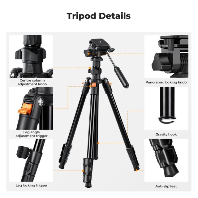 • * 【Zweistufige Mittelsäule】Die maximale Höhe des Stativs mit Mittelsäule beträgt 196 cm, ohne Mittelsäule beträgt die maximale Höhe 133 cm. Der Winkel der Beine kann in drei Positionen eingestellt werden, um den Anforderungen verschiedener Szenarien gerecht zu werden.