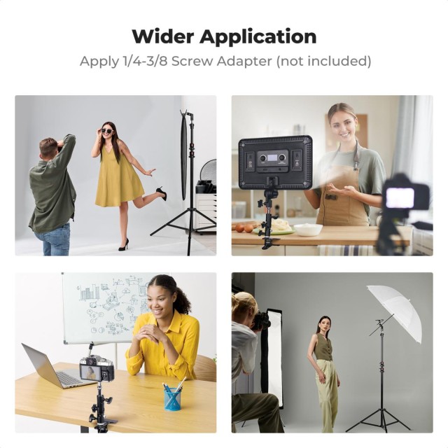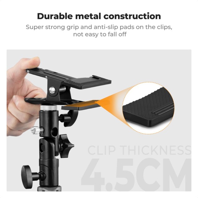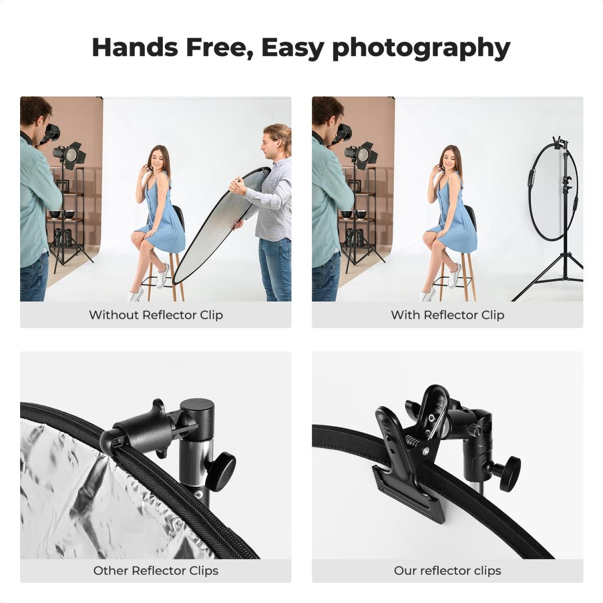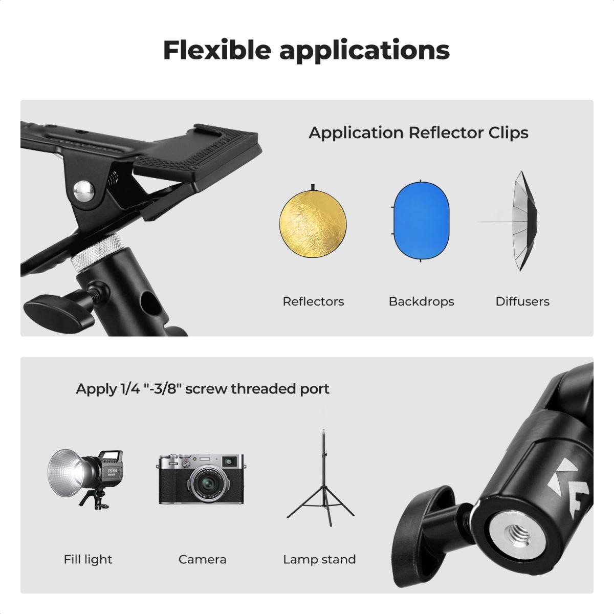 Die K&F CONCEPT Heavy-Duty-Fotoreflektorhalterung verfügt über einen stabilen Metallclip, eine rutschfeste Polsterung und eine universelle 5/8"-Basis, sodass Fotografen Reflektoren oder Schirme ohne Hilfe eines Assistenten sicher befestigen können, um eine stabile und bequeme Lichtsteuerung zu erzielen.