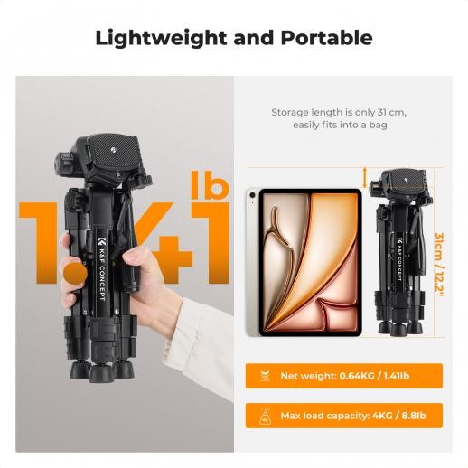Das K&F Concept S233A0 ist ein kompaktes und leichtes Stativ, das für Fotografen und Videografen entwickelt wurde, die Mobilität ohne Einbußen bei der Stabilität benötigen. Seine speziell geformten Beinrohre aus ABS + Aluminiumlegierung sind stabiler und kompakter als herkömmliche Rundrohre, wodurch es sich ideal für Reisen und Aufnahmen unterwegs eignet. Das Stativ lässt sich auf nur 30 cm zusammenklappen und wiegt nur 638 g, kann jedoch Lasten von bis zu 4 kg tragen, darunter Micro-Single-Kameras, kleine DSLRs und Zubehör.