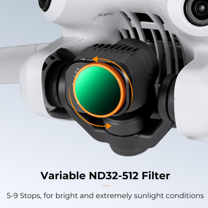 Revolutionieren Sie Ihre Drohnenvideografie mit dem variablen ND32-512-Filter von K&F Concept, einem unverzichtbaren Upgrade, das speziell für die DJI Mini 4 Pro entwickelt wurde, um intensives Sonnenlicht zu bewältigen und eine professionelle Belichtungssteuerung während des Fluges zu ermöglichen. Dieser variable Neutraldichtefilter bietet eine stufenlose Einstellbarkeit von ND32 (5 Blendenstufen) bis ND512 (9 Blendenstufen) und ermöglicht Piloten die Feinabstimmung der Lichteinstrahlung für seidig glatte Luftaufnahmen, dramatische Langzeitbelichtungen von Wolken oder Wellen oder Effekte mit geringer Schärfentiefe – und das alles unter Beibehaltung lebendiger Farben, scharfer Details und natürlicher Kontraste, ohne unerwünschte Farbstiche oder Artefakte, die bei minderwertigen Filtern auftreten.
