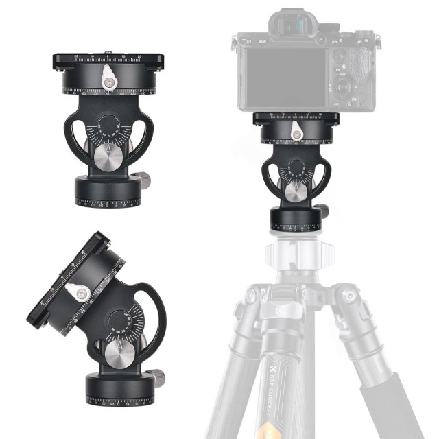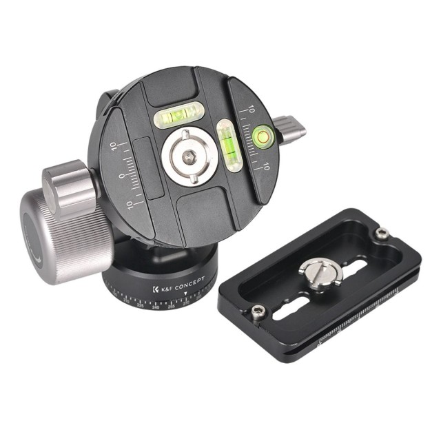 K&F Concept VH-60L Doppel-Panorama-Design Aluminiumlegierung Stativ-Kugelkopf. Die Schnellwechselplatte entspricht dem Acra-Standard und kann mit Gimbals anderer Marken installiert werden. Die Schraube Schnittstelle auf der Oberseite ist eine 1/4-Zoll-abnehmbare Schraube, die bequemer sein kann, die Kamera zu installieren