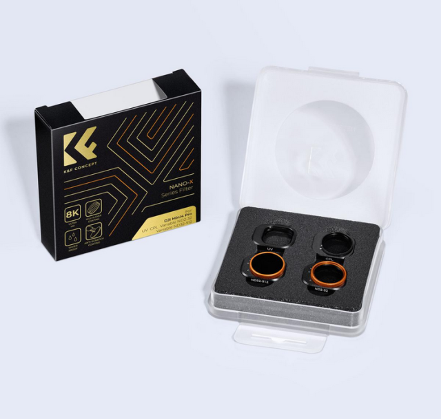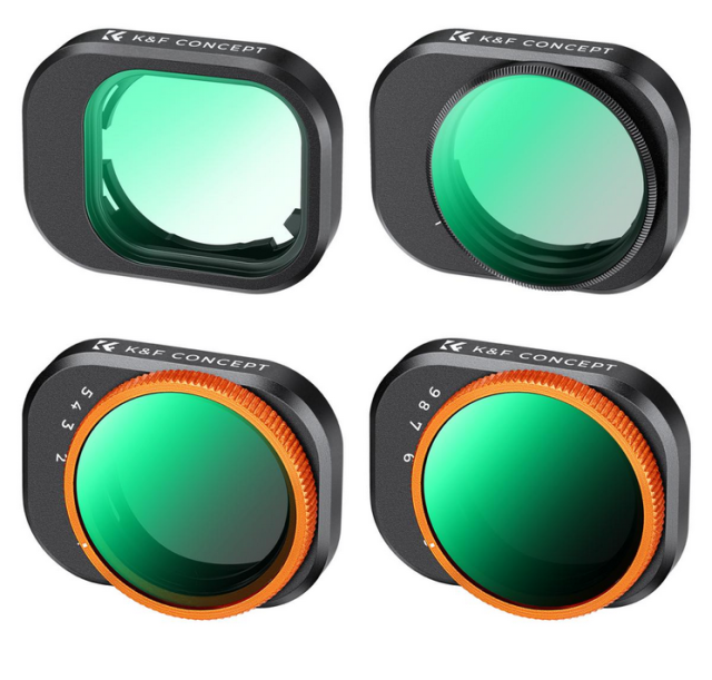 Das K&F Concept VND + UV + CPL Filter Kit für DJI Mini 4 Pro bietet vier essentielle Filter (UV, CPL, ND2-32, ND32-512), die eine Lichtreduzierung um 1-9 Stufen und Schutz für verbesserte Luftaufnahmen bieten. Hergestellt aus mehrfach vergütetem optischem AGC-Glas, gewährleisten diese ultraleichten Filter eine hervorragende Bildqualität und Gimbal-Sicherheit.