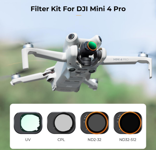 Umfassendes Mini 4 Pro Filter Kit: Dieses 4er-Filterset enthält UV-, CPL-, ND2-32- und ND32-512-Filter, die ein breites Spektrum an Szenarien für die Drohnenfotografie abdecken, von der Reduzierung von Blendeffekten und dem Schutz des Objektivs bis hin zur Steuerung des Lichts für ausgewogene Belichtungen bei unterschiedlichen Lichtverhältnissen.