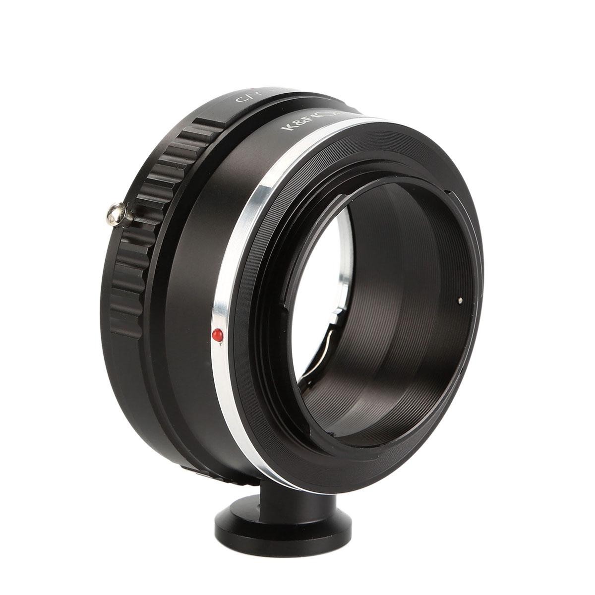 Der K&F Contax/Yashica-zu-Sony-E-Objektivadapter mit Stativhalterung ermöglicht die Verwendung von C/Y-Mount-Objektiven an spiegellosen Sony-E-Mount-Kameras. Er besteht aus Messing und Aluminium, bietet eine stabile manuelle Bedienung, unterstützt die Unendlichkeitsfokussierung und verfügt über eine Stativhalterung für schwerere Objektive.
