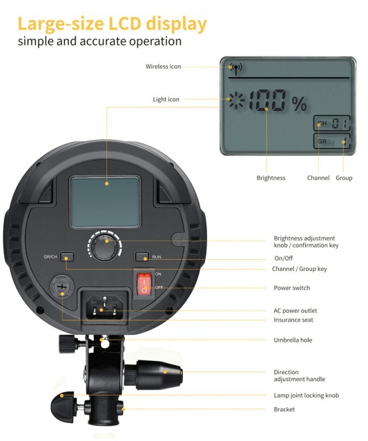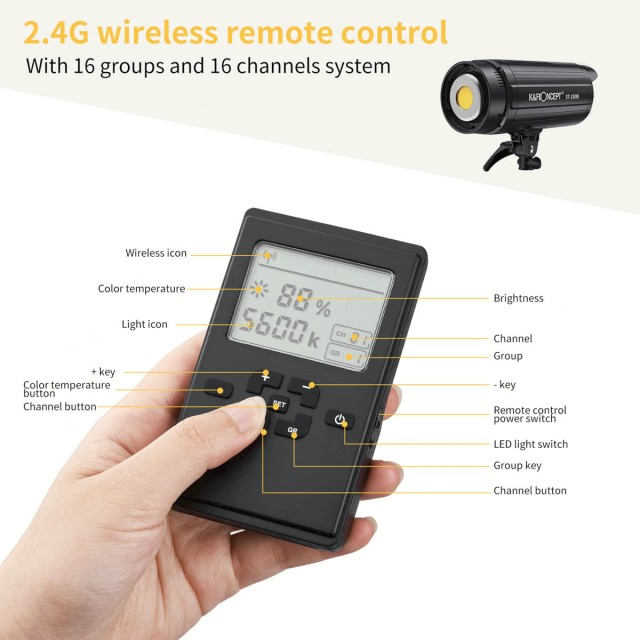 Mit einem CRI von 95 und einem TLCI von 95+ sorgt die ST-150W für natürliche Hauttöne und eine genaue Farbwiedergabe. Die Helligkeit kann mithilfe des hinteren Dimmerrads oder der mitgelieferten Funkfernbedienung stufenlos von 10 % bis 100 % eingestellt werden. Ein großes, übersichtliches LCD-Display zeigt die Helligkeit in Prozent, den Kanal und die Gruppeneinstellungen an, sodass mehrere Leuchten gruppiert und gleichzeitig gesteuert werden können.
