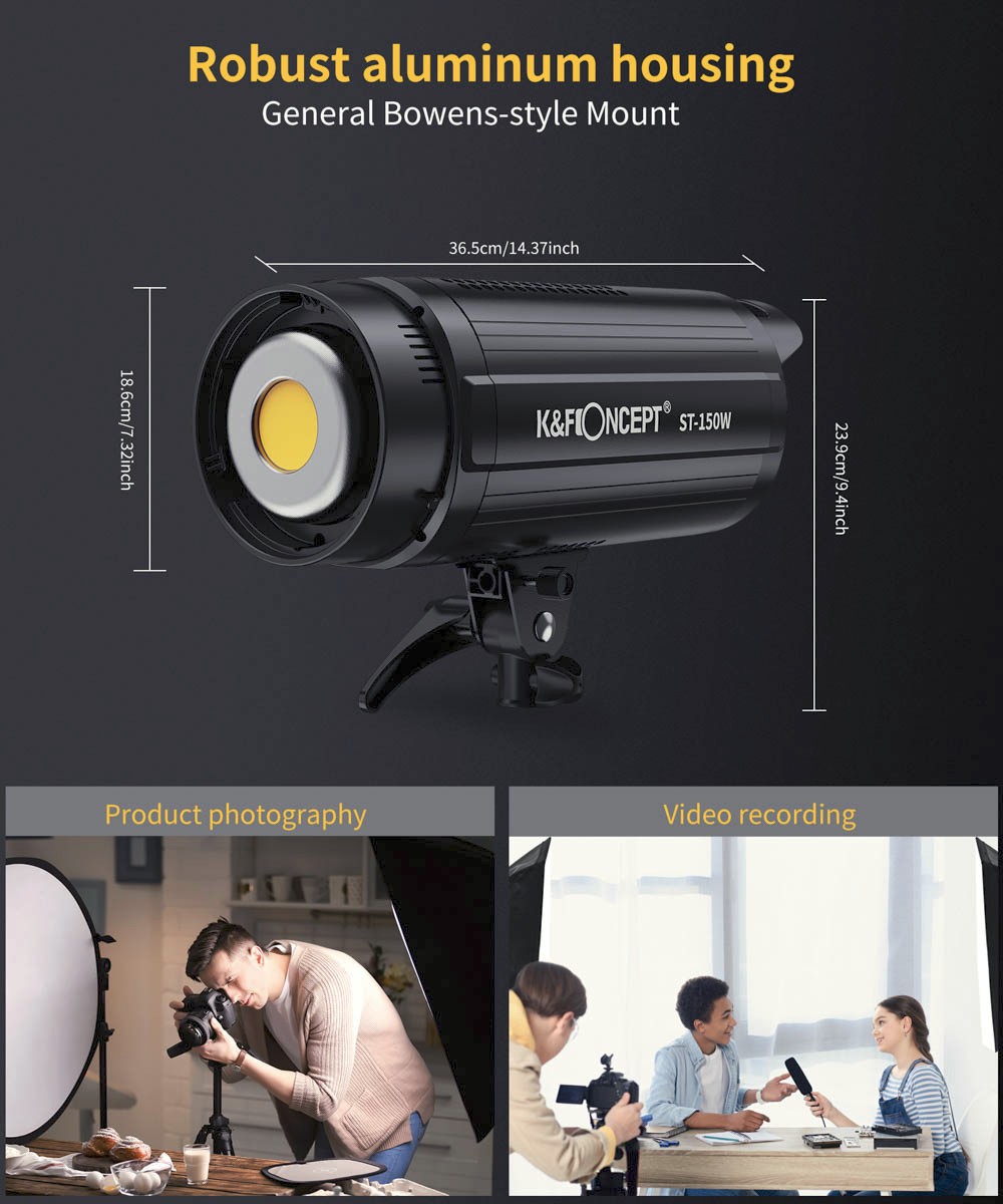 Das Licht verfügt über ein robustes Gehäuse aus Aluminiumlegierung und ein effizientes Wärmeableitungssystem mit einem hochwertigen Kühlkörper und einem extrem leisen Lüfter, der für langfristige Stabilität sorgt, ohne die Audioaufnahme zu beeinträchtigen. Die beliebte Bowens-Halterung bietet eine breite Kompatibilität mit Softboxen und Modifikatoren, während der mitgelieferte Reflektor und der Schirmhalterung eine flexible Lichtgestaltung ermöglichen. Mit seiner robusten Bauweise, der Fernbedienungsfunktion und der universellen Stativhalterung ist das K&F ST-150W ein zuverlässiges Beleuchtungswerkzeug für den Einsatz im Studio und vor Ort.