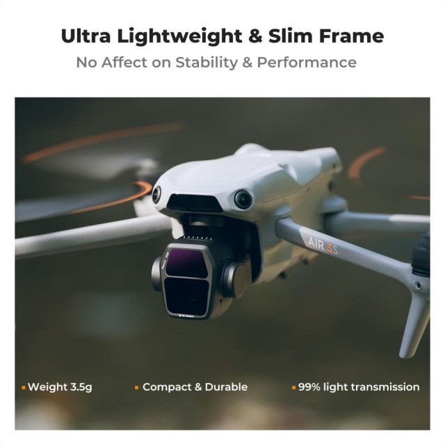 Das K&F Concept ND Filter-Set wurde speziell für das DJI Air 3S Dual-Kamera-System entwickelt. Die ND8, ND16, ND32 und ND64 Filter-Kits helfen dabei, unterschiedliche Lichtstärken von 3-6 Blendenstufen zu reduzieren, die Verschlusszeit präzise zu steuern, eine korrekte Belichtungssteuerung bei unterschiedlichen Lichtverhältnissen zu erhalten und glatte Aufnahmen zu produzieren. Dieser K&F Concept Air 3S-Filter besteht aus Top AGC Optical Glass mit beidseitigen 28-Schicht-Multifunktions-Nanometer-Beschichtungen, die helfen, lebendige Farben einzufangen und eindringliche Aufnahmen zu machen, die Beschichtungen schützen die Filter vor Verschleiß und Kratzern, Staub, Schmutz und Wasser abweisend.