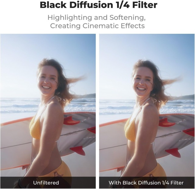 Der K&F Concept Black Soft 1/4 Filter für DJI Osmo Action 6 ist ein hochauflösender Aufsteckfilter, der einen weichen, kinoreifen Look erzeugt und sich schnell und sicher anbringen lässt. Mit hochwertigem optischem Glas und einer fortschrittlichen 28-lagigen Nanobeschichtung mildert er sanft Glanzlichter und reduziert Blendeffekte, ohne die Bildschärfe zu beeinträchtigen – ideal für Kreative, die ihren Actionaufnahmen eine traumhafte, filmreife Ästhetik verleihen möchten.