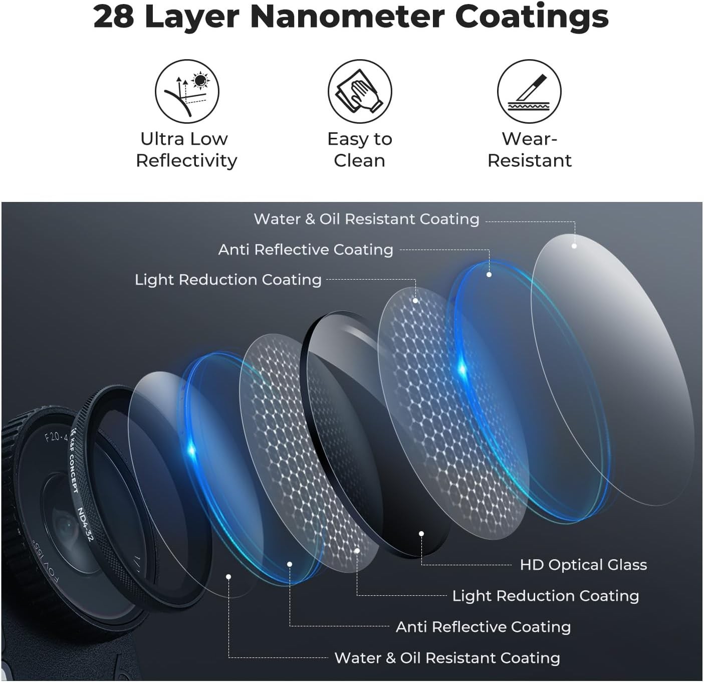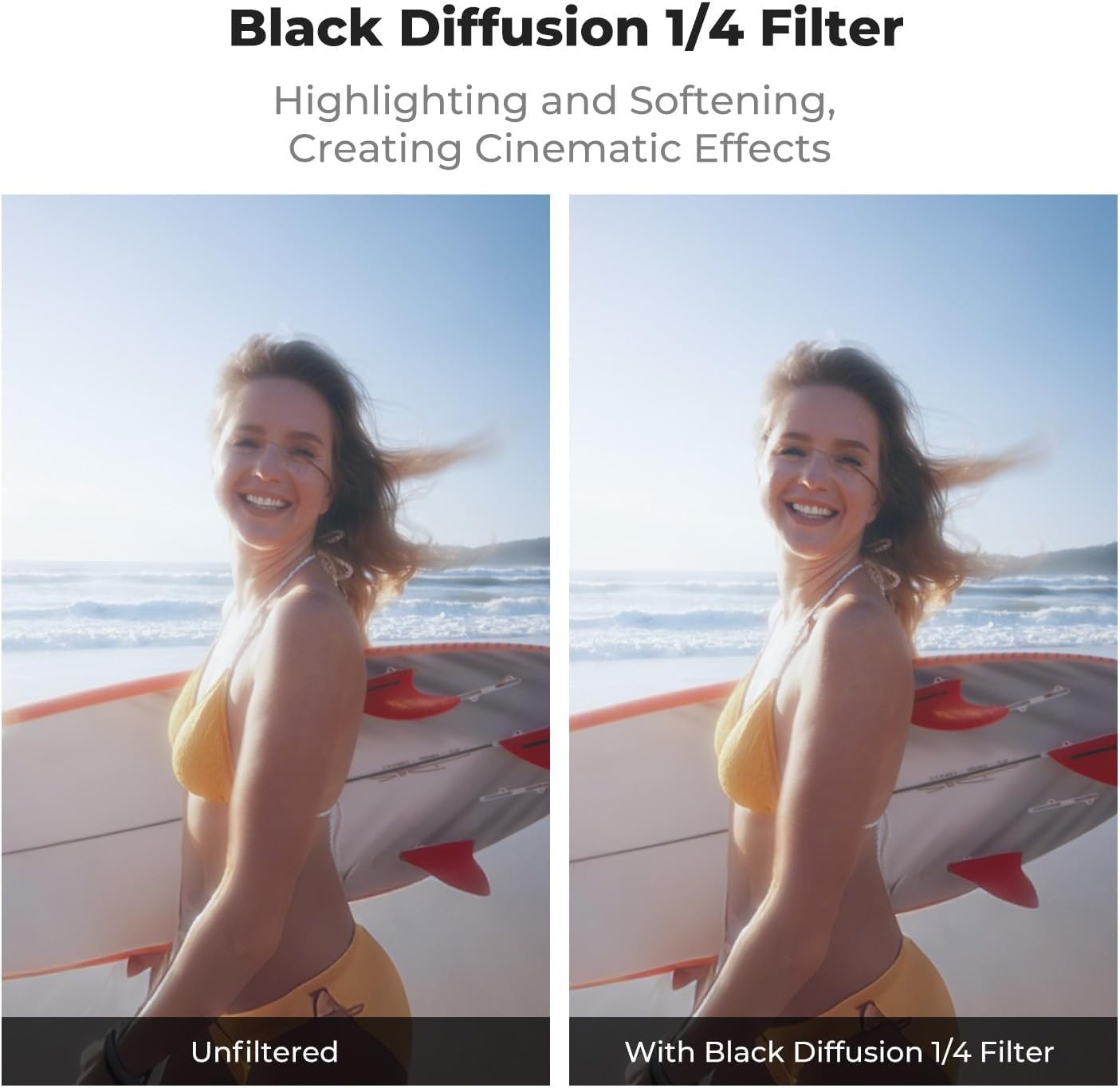 Der Diffusionseffekt des Black Mist 1/4 Filter mildert subtil Glanzlichter und reduziert grelle Blendeffekte, wodurch ein verschwommener, filmischer Glanz entsteht, während die allgemeine Bildschärfe erhalten bleibt. Damit eignet er sich ideal für Storytelling, Vlogging, Reisen und filmische Actionaufnahmen, bei denen Atmosphäre und Stimmung eine wichtige Rolle spielen. Der aus hochauflösendem optischem Glas gefertigte Filter liefert kompromisslose Schärfe und präzise Farbwiedergabe. Seine fortschrittliche 28-lagige Nanobeschichtung minimiert Reflexionen und bietet gleichzeitig einen hydrophoben, kratzfesten und schmutzabweisenden Schutz, der für Langlebigkeit und einfache Reinigung in anspruchsvollen Umgebungen sorgt. Dieser Filter wurde sowohl für Profis als auch für Enthusiasten entwickelt und verbessert die visuelle Qualität bei gleichzeitig schnellem und problemlosem Arbeitsablauf.