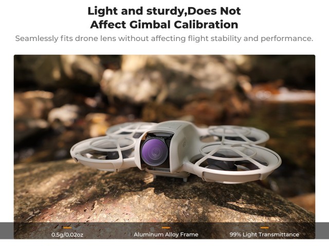 Jeder Filter besteht aus mehrschichtig beschichtetem optischem HD-Glas, das die Farbechtheit wiederherstellt, wasserabweisend, kratzfest und leicht zu reinigen ist. Der ultraleichte Rahmen aus einer Aluminiumlegierung sorgt für einen sicheren Sitz ohne zusätzliches Gewicht und hält die Filter auch bei schnellen Manövern stabil. Ein kompaktes Aufbewahrungsetui und ein Reinigungstuch zur bequemen Aufbewahrung und Wartung sind im Lieferumfang enthalten und machen dieses Kit zu einem hervorragenden Zubehör für professionelle und Hobby-Drohnenfotografen.