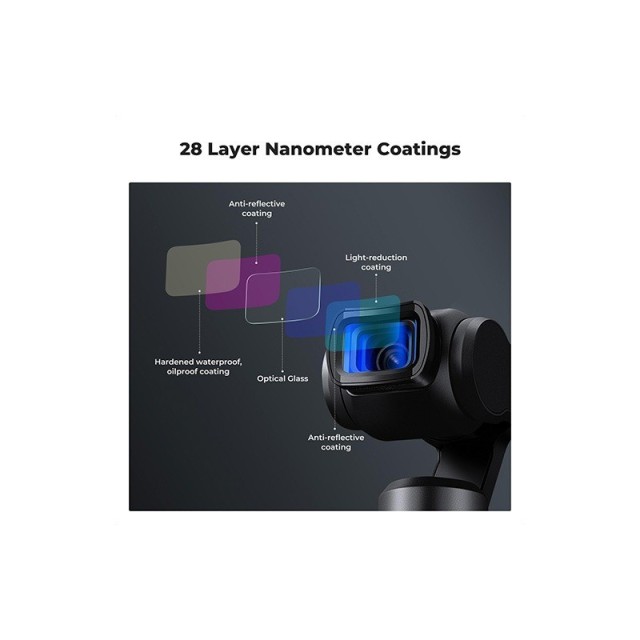 - 28 Mehrschichtige Beschichtungen: Mehrschichtige Beschichtung, die Wasser, Staub und Fett abweist und Kratzer verhindert. Einfach zu reinigen und zu pflegen, und schützt Ihr Osmo Pocket 3 Objektiv von allen Seiten. Die schwarz lackierte Oberfläche des Filterrahmens minimiert Reflektionen und reduziert die Auswirkungen auf das Bild.