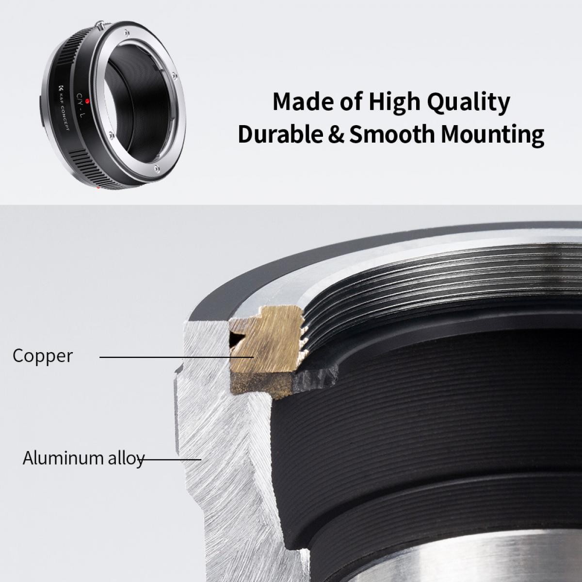 Der K&F Concept C/Y-L-Adapter für manuelles Fokussieren ist mitContax/Yashica (C/Y) -Objektiven für Kameras mit L-Mount-Bajonett kompatibel.