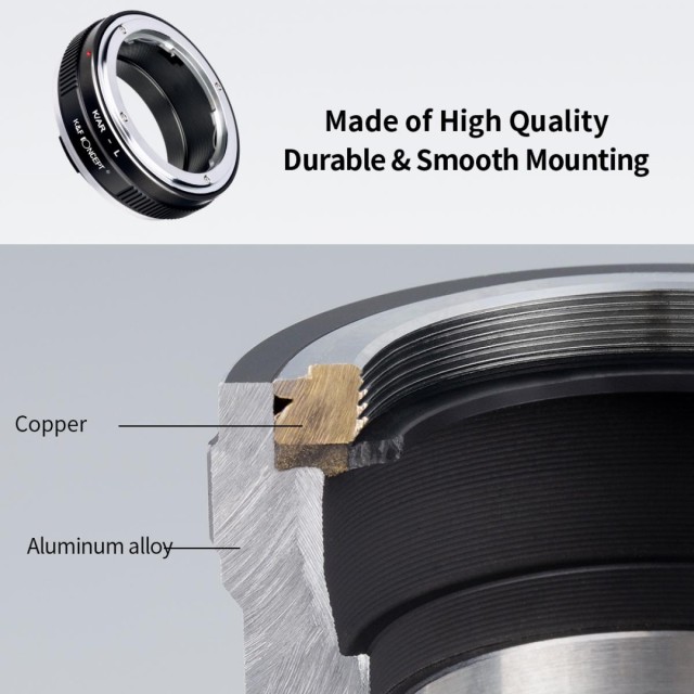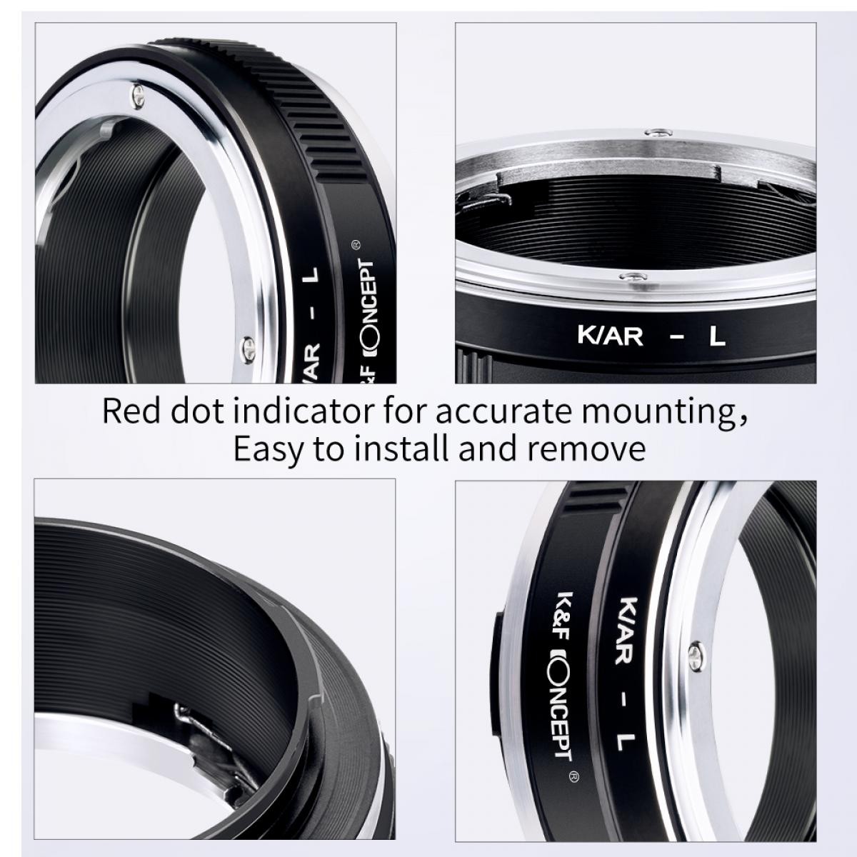 Der hochpräzise Objektivadapter K/AR-L von K&F ermöglicht es Fotografen, klassische Konica-Objektive mit AR-Anschluss mit modernen Leica-Kameras mit L-Anschluss zu kombinieren. Dieser aus hochwertiger Kupfer- und Aluminiumlegierung gefertigte Adapter bietet hervorragende Haltbarkeit, präzise Ausrichtung und reibungslose Montage ohne Spiel während des Betriebs.