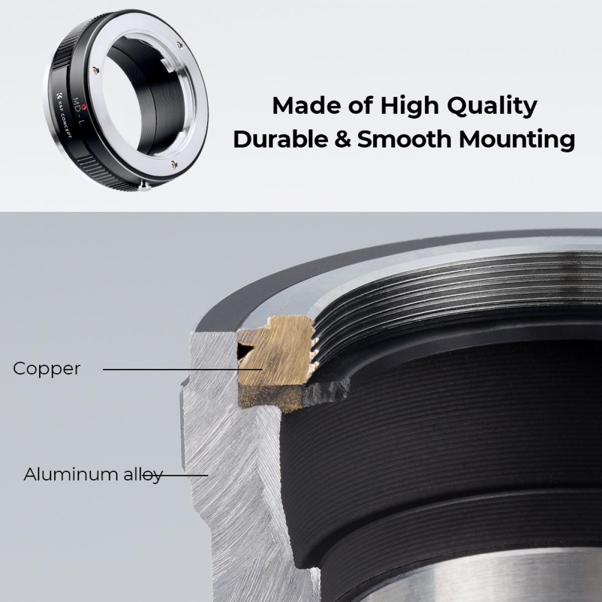 Der K&F Concept MD-L Adapter für manuelles Fokussieren ist kompatibel mit Minolta Rokkor-Objektiven (SR/MD/MC) für Kameras mit L-Mount-Bajonett.