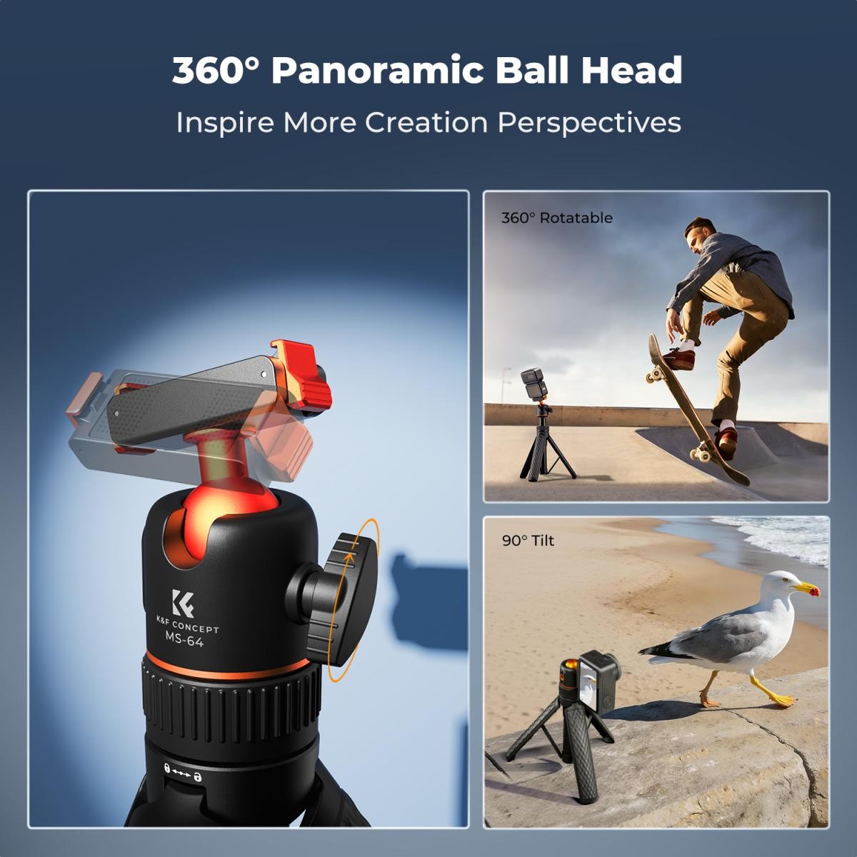 Die Konstruktion mit Kugelkopf ermöglicht eine Drehung um 360° und eine Neigung um 90°, was eine freie Winkeleinstellung und die Möglichkeit vertikaler Aufnahmen gewährleistet. Das integrierte 1/4"-Gewinde am Kugelkopf ermöglicht die Befestigung eines Mikrofons oder einer Zusatzbeleuchtung für eine bessere Videoqualität.
